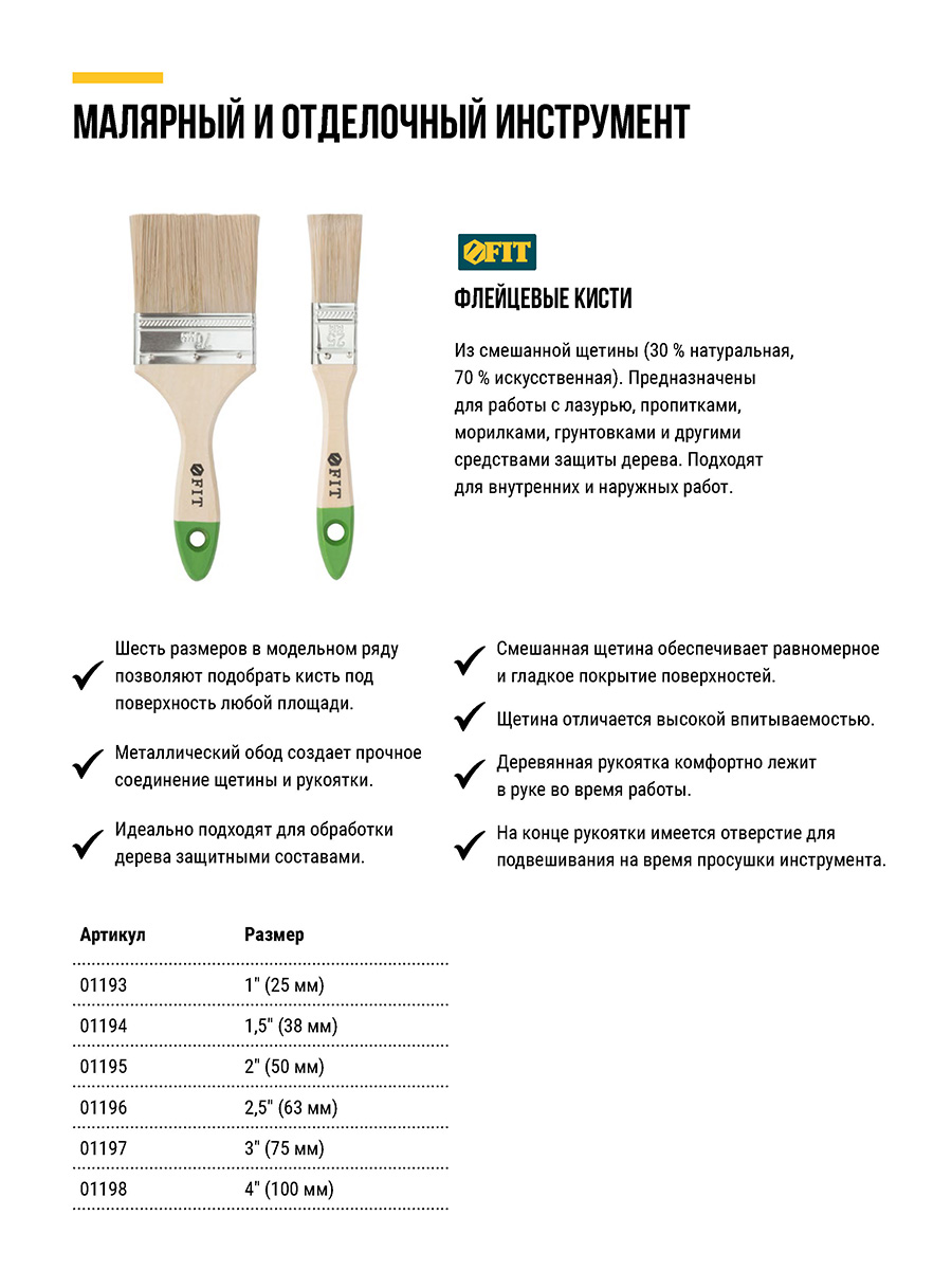 «Микс». Для работы с лазурями, пропитками, морилками, грунтовками и другими средствам защиты дерева. Материал: смешанная щетина (30% натуральная, 70% искусственная), деревянная ручка.