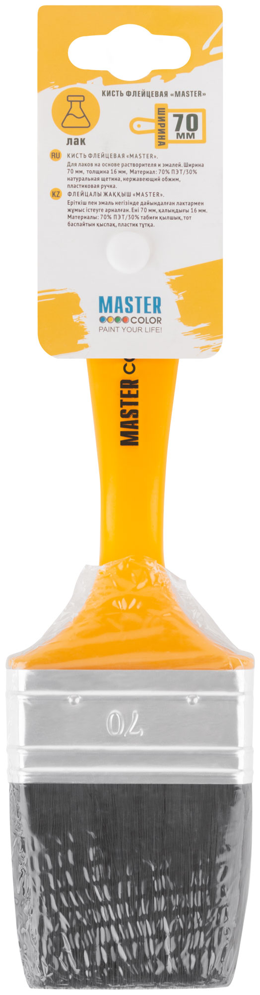 Кисть флейцевая, толщ. 16 мм, 70% ПБT/30% чёрн.натур. щетина, нерж. обжим, пласт.ручка, ширина 70 мм