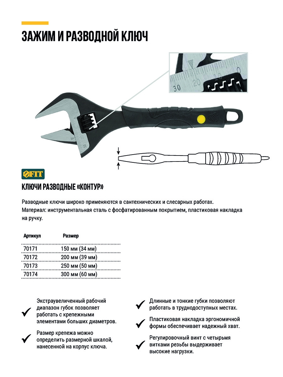 «Контур». Экстраувеличенный рабочий диапазон губок. Размерная шкала. Уменьшенная толщина губок для работы в труднодоступных местах. Материал: инструментальная сталь с фосфати рованным покрытием, пластиковая накладка на ручку. Упаковка: пластиковый подвес.