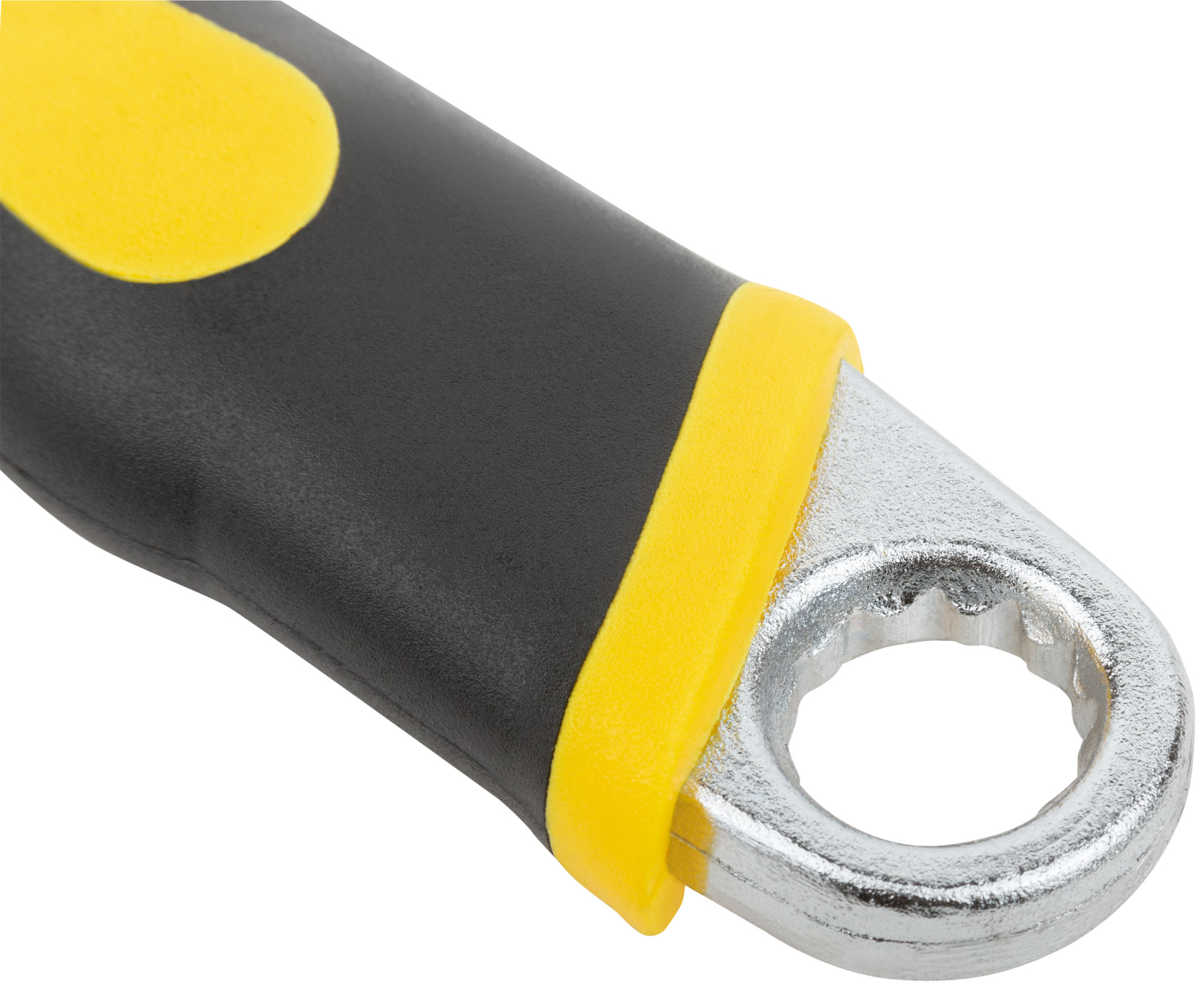 «Старт». Размерная шкала. Накидной ключ, встроенный в ручку. Материал: штампованная термообработанная инструментальная сталь с хромированным покрытием, ПВХ накладка на ручку. Упаковка: пластиковый подвес.