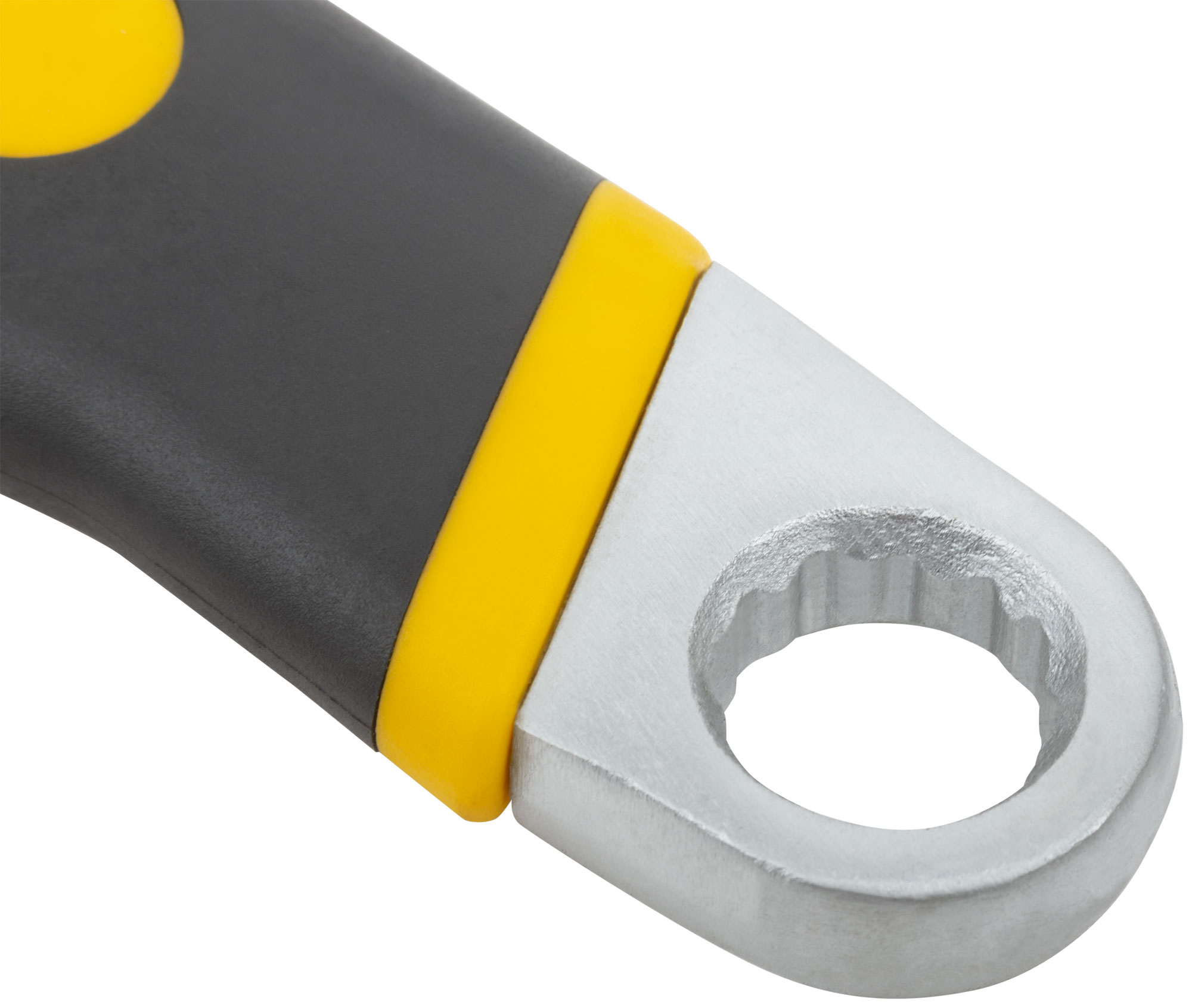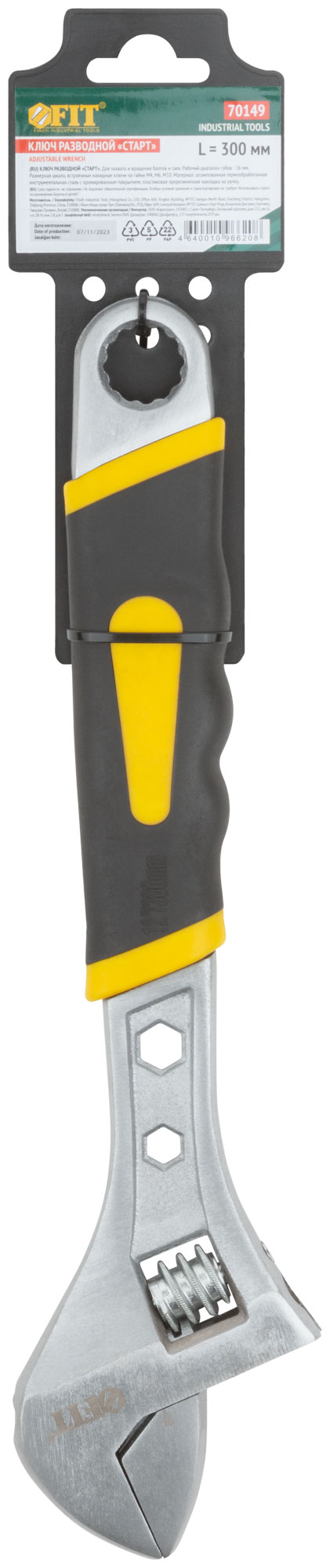 «Старт». Размерная шкала. Накидной ключ, встроенный в ручку. Материал: штампованная термообработанная инструментальная сталь с хромированным покрытием, ПВХ накладка на ручку. Упаковка: пластиковый подвес.