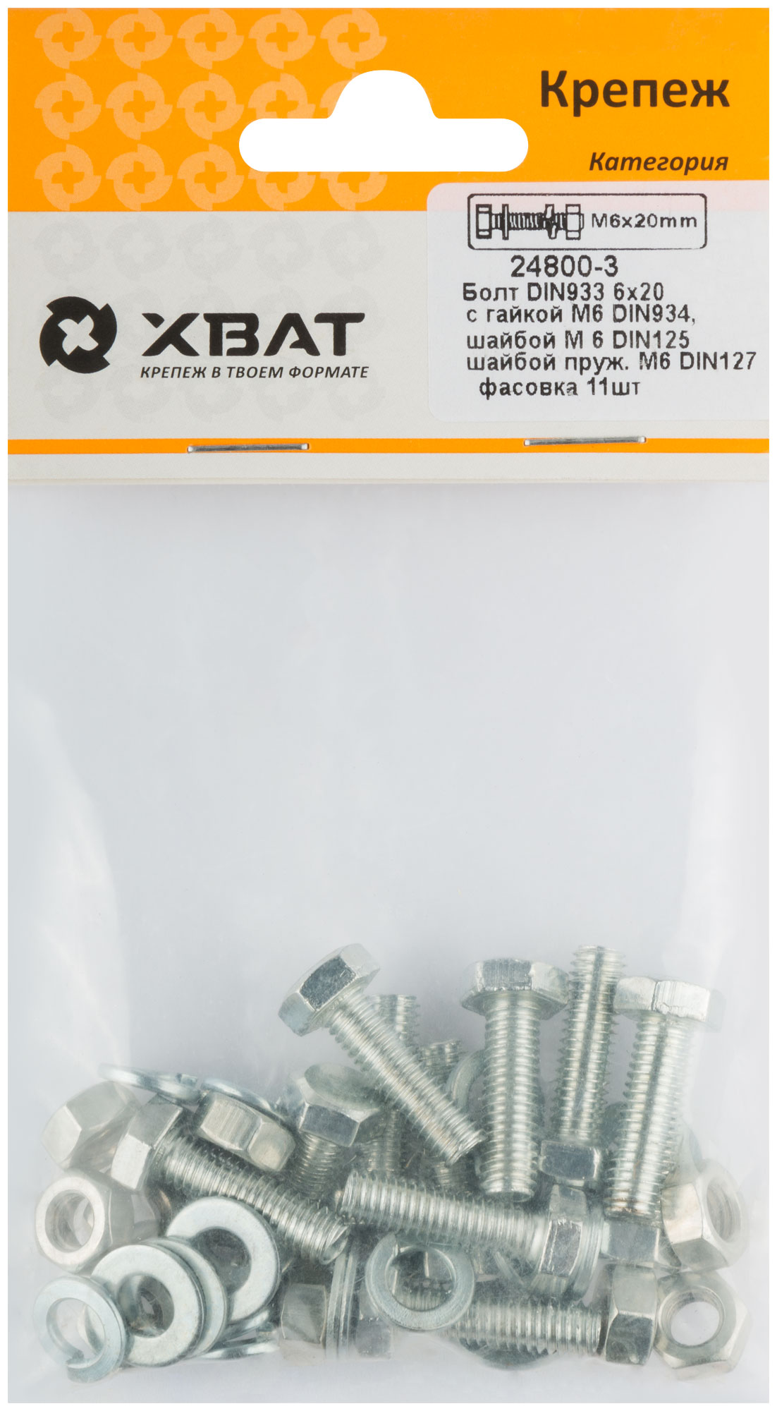 Комплект: Болт DIN933 6х20, с гайкой DIN934 М6, шайбой DIN125 М6, шайбой пруж. DIN127 М6 (фасовка 11 шт.)