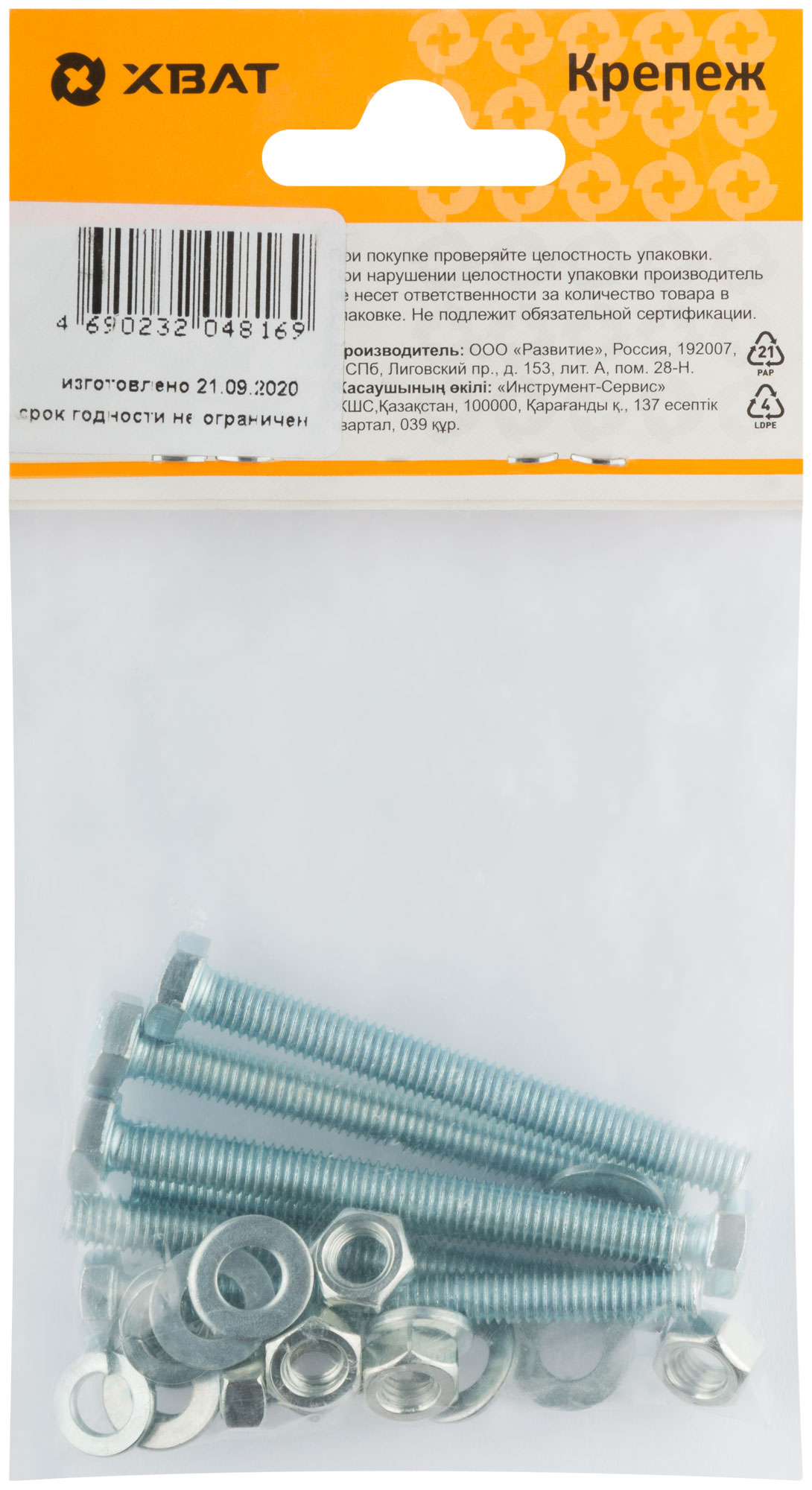 Комплект: Болт DIN933 6х60, с гайкой DIN934 М6, шайбой DIN125 М6, шайбой пруж. DIN127 М6 (фасовка 6 шт.)