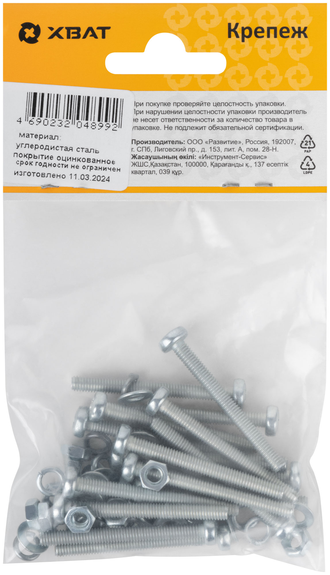 Комплект метрического крепежа состоит из: винт DIN7985, гайка DIN934, шайба DIN125, шайба гроверная DIN127. Рекомендуются для крепления и соединения узлов и деталей в машиностроении, строительстве. Материал: конструкционная оцинкованная сталь.