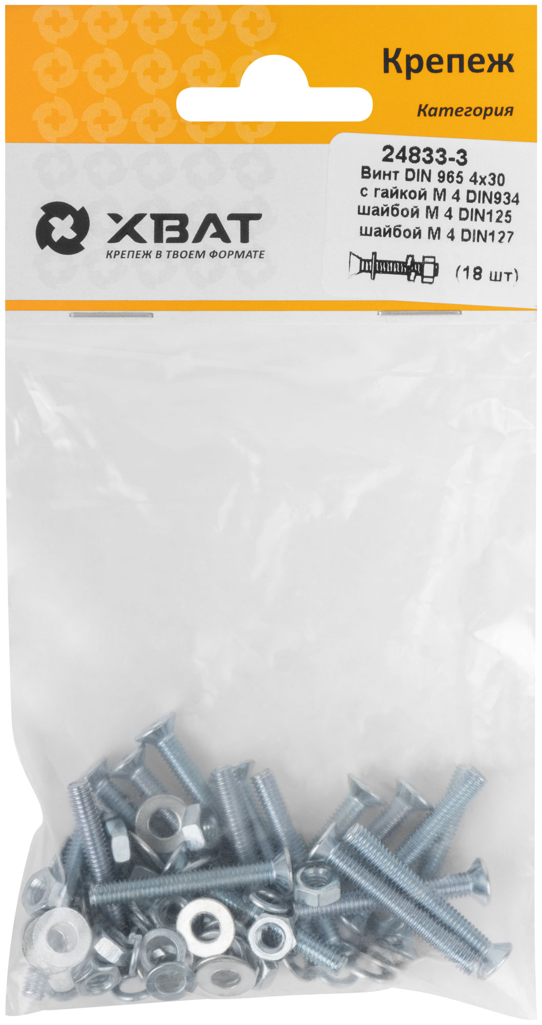 Комплект: Винт DIN965 4х30, с гайкой DIN934 М4, шайбой DIN125 М4, шайбой DIN127 М4 (фасовка 18 шт.)