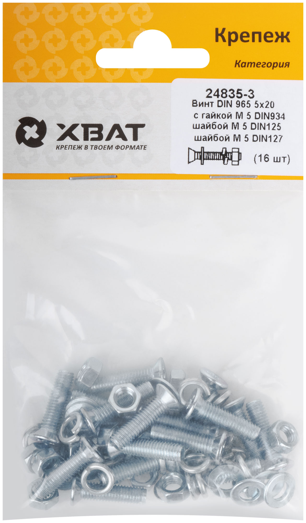 Комплект: Винт DIN965 5х20, с гайкой DIN934 М5, шайбой DIN125 М5, шайбой DIN127 М5 (фасовка 16 шт.)