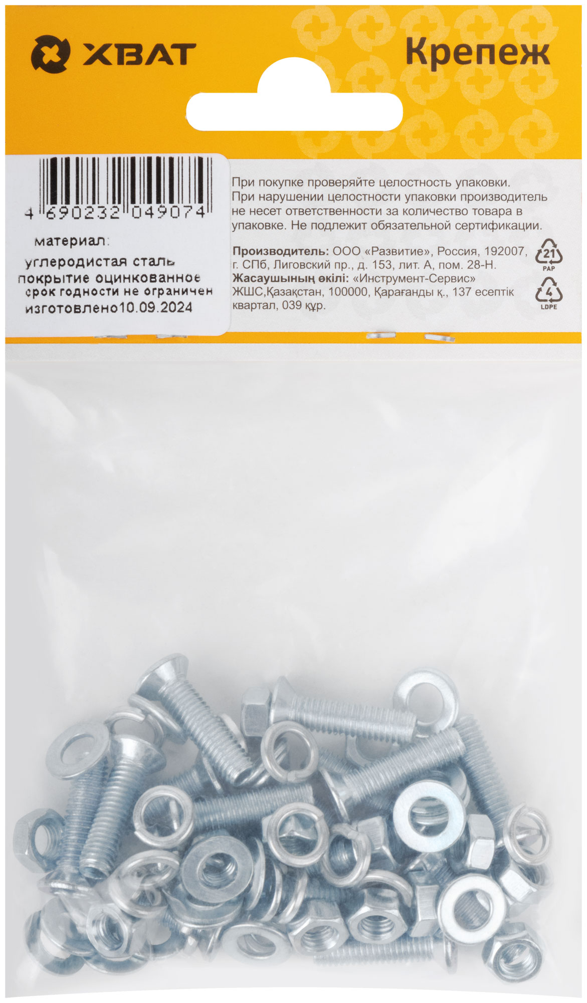 Комплект метрического крепежа состоит из: винт DIN965, гайка DIN934, шайба DIN125, шайба гроверная DIN127. Рекомендуются для крепления и соединения узлов и деталей в машиностроении, строительстве. Материал: конструкционная оцинкованная сталь.