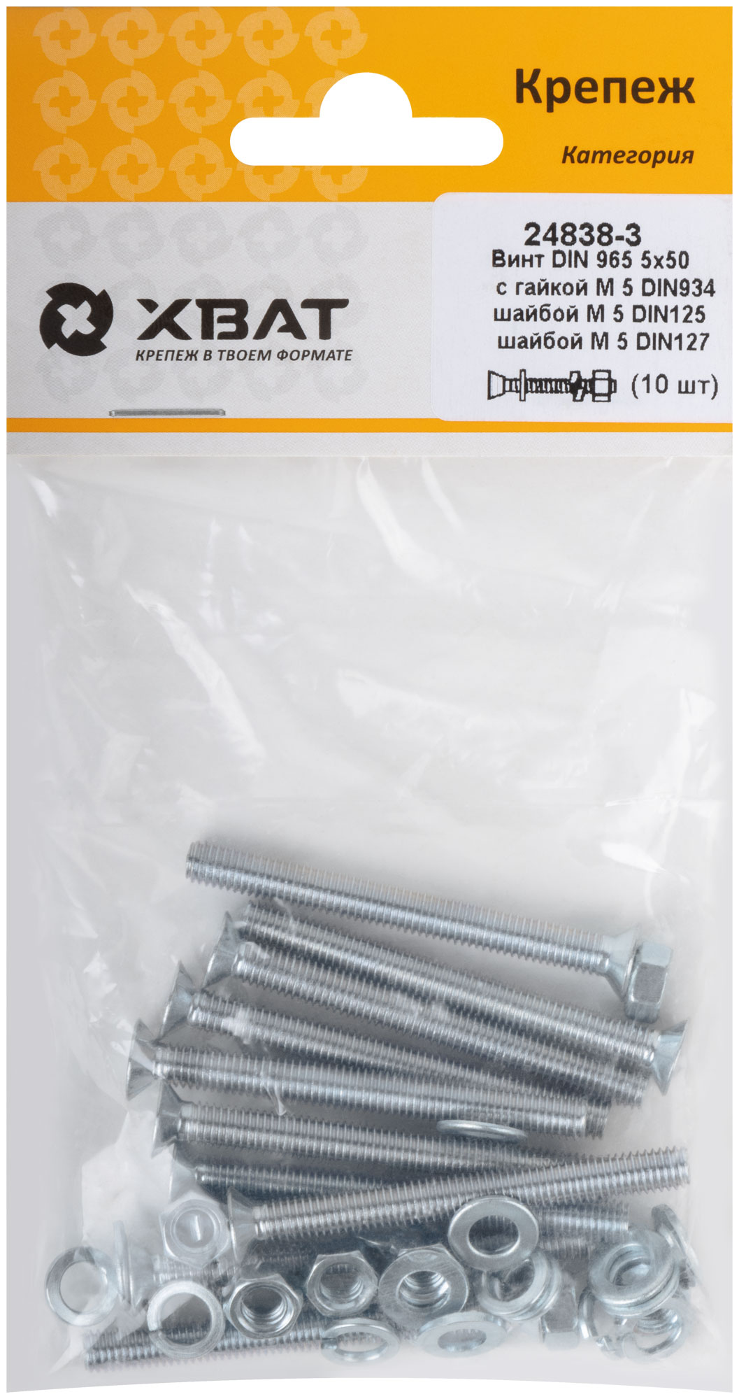 Комплект: Винт DIN965 5х50, с гайкой DIN934 М5, шайбой DIN125 М5, шайбой DIN127 М5 (фасовка 10 шт.)