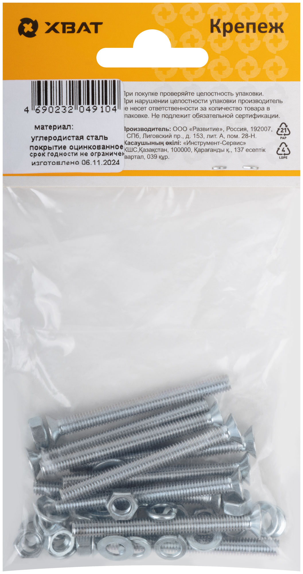 Комплект метрического крепежа состоит из: винт DIN965, гайка DIN934, шайба DIN125, шайба гроверная DIN127. Рекомендуются для крепления и соединения узлов и деталей в машиностроении, строительстве. Материал: конструкционная оцинкованная сталь.