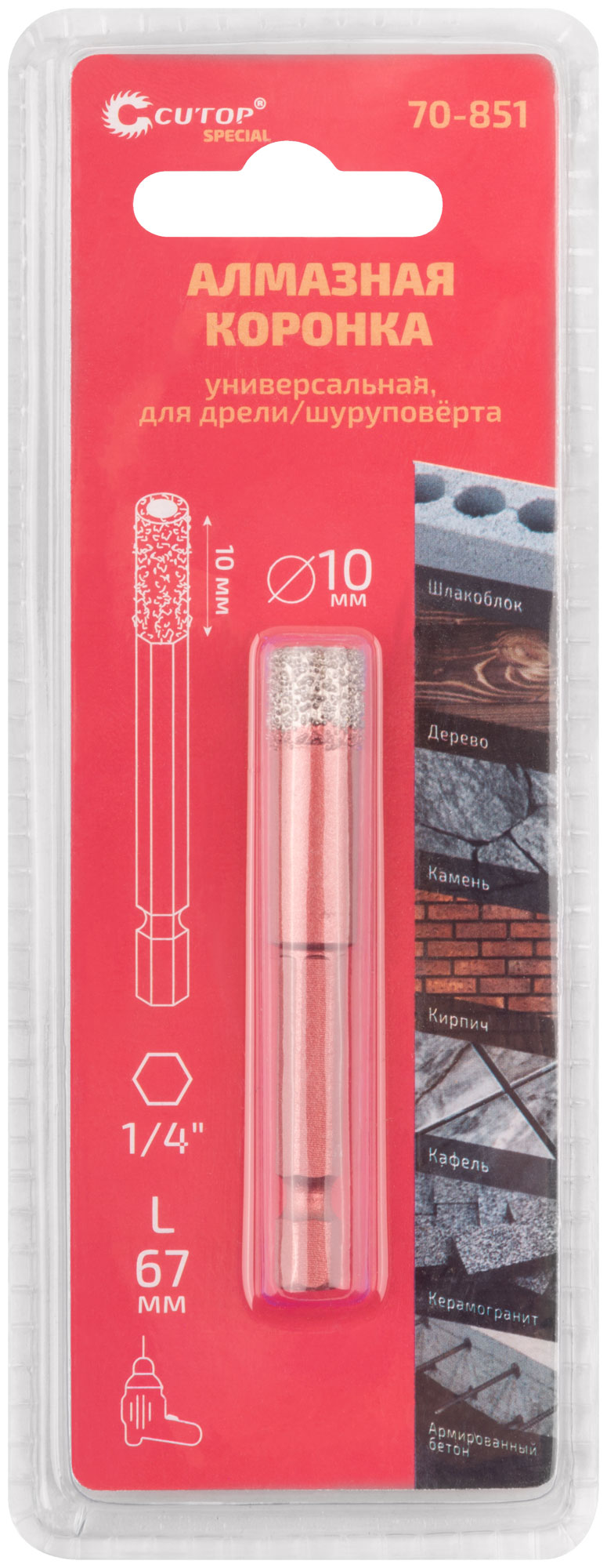Коронка алмазная универсальная CUTOP Special, шестигранный хвостовик 1/4", 10 x 10 х 67 мм