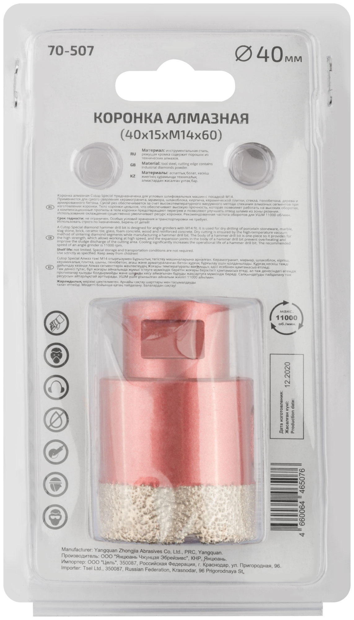 Коронка алмазная Cutop Special предназначена для УШМ с посадкой М14. Применяется для сухого сверления: керамогранита, мрамора, шлакоблока, кирпича, керамической плитки, стекла, пенобетона, дерева и армированного бетона. Сухой рез обеспечивается за счет высокотемпературного вакуумного метода спекания алмазных сегментов при изготовлении коронки. Тело коронки цельное, что обеспечивает высокую прочность, которая позволяет работать на самых высоких оборотах. Использование охлаждения существенно увеличивает ресурс коронки. В коронках диаметром 25-68 мм имеются компенсационные пропилы, которые предотвращают перегрев и позволяют улучшать отвод шлама из зоны резания. Материал: Инструментальная сталь, технические алмазы. Упаковка: блистер.