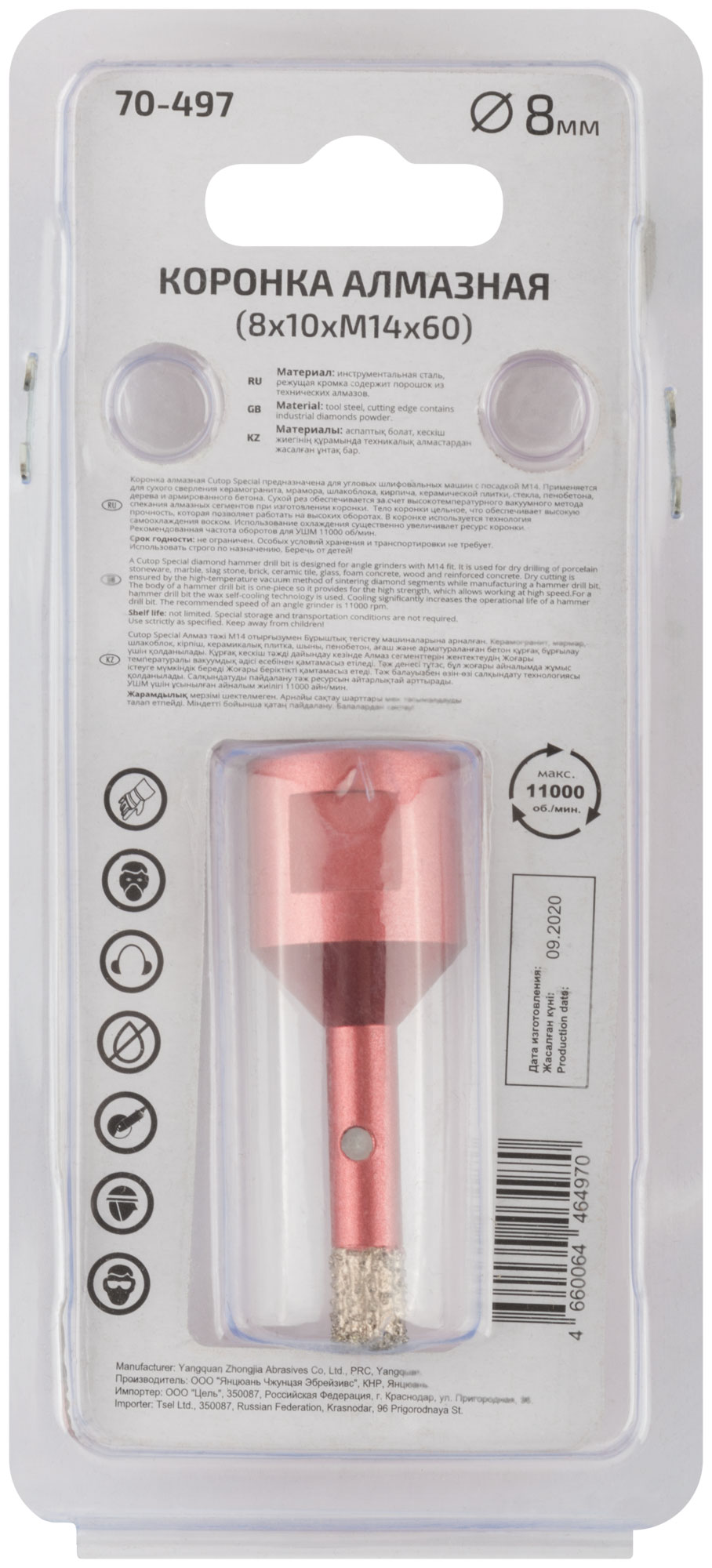 Коронка алмазная Cutop Special предназначена для УШМ с посадкой М14. Применяется для сухого сверления: керамогранита, мрамора, шлакоблока,кирпича, керамической плитки, стекла, пенобетона, дерева и армированного бетона. Сухой рез обеспечивается за счет высокотемпературного вакуумного метода спекания алмазных сегментов при изготовлении коронки. Тело коронки цельное, что обеспечивает высокую прочность, которая позволяет работать на самых высоких оборотах. Использование охлаждения существенно увеличивает ресурс коронки. В коронках диаметром 6-12 мм внутри размещается специальный охлаждающий материал. Материал: Инструментальная сталь, технические алмазы. Упаковка: блистер.