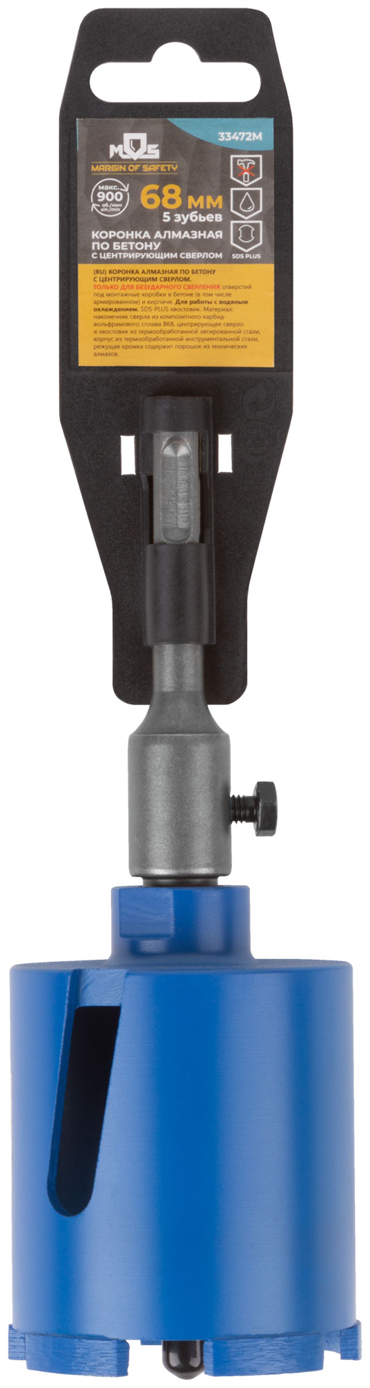 Коронка алмазная с центрирующим сверлом 8 мм и хвостовиком SDS-PLUS. Для безударного сверления отверстий под монтажные коробки в бетоне (в том числе армированном) и кирпиче. Для работы с водяным охлаждением. Материал: корпус из инструментальной стали, хвостовик и центрирующее сверло из легированной стали, наконечник сверла из карбида вольфрама, режущая кромка содержит порошок из технических алмазов. Упаковка: пластиковый подвес.