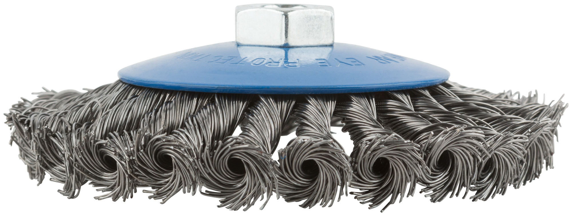 Тип «колесо», с наклоном. Для УШМ. Для очистки поверхностей от краски и ржавчины. Гайка М14. Витая стальная проволока. Материал: термообработанная инструментальная сталь. Упаковка: картонная коробка.