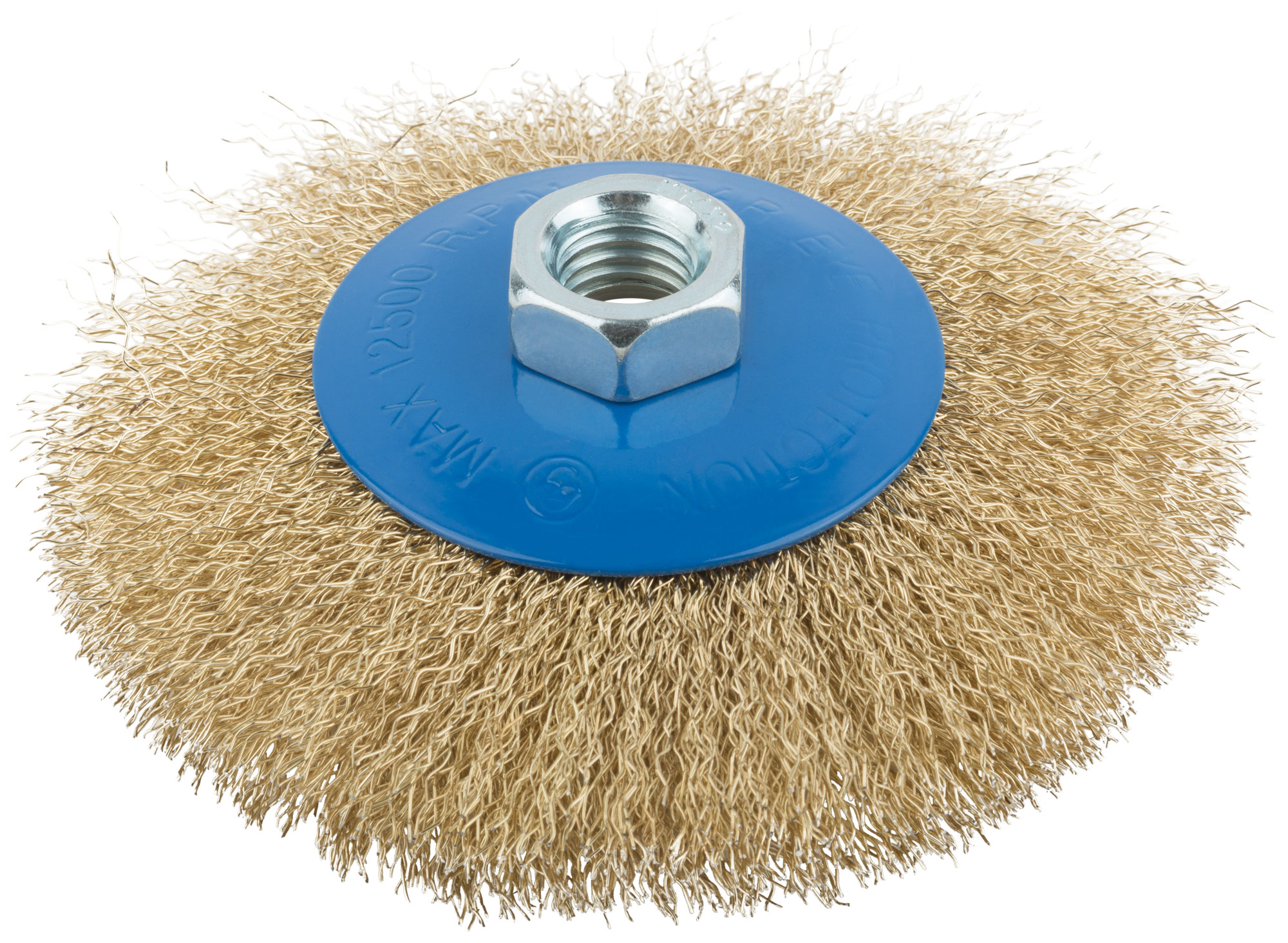 Корщетка, тип "колесо" с наклоном, гайка М14, стальная волнистая латунированная проволока 115 мм