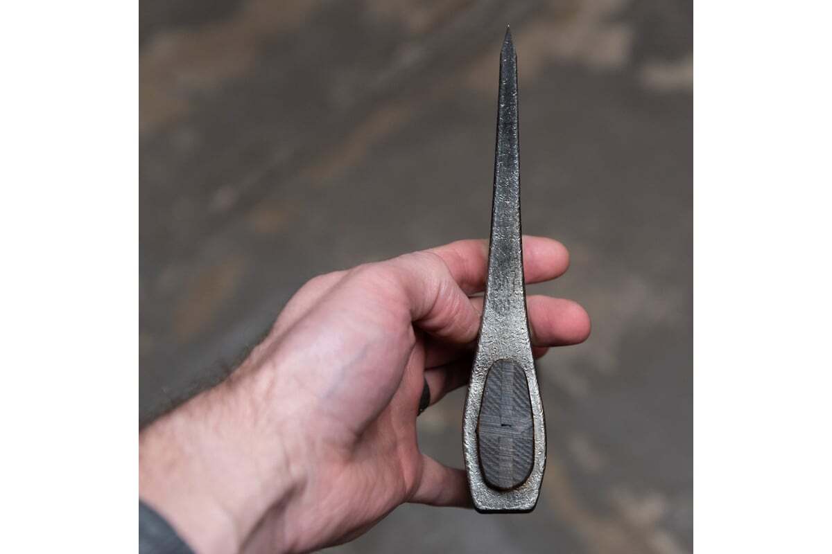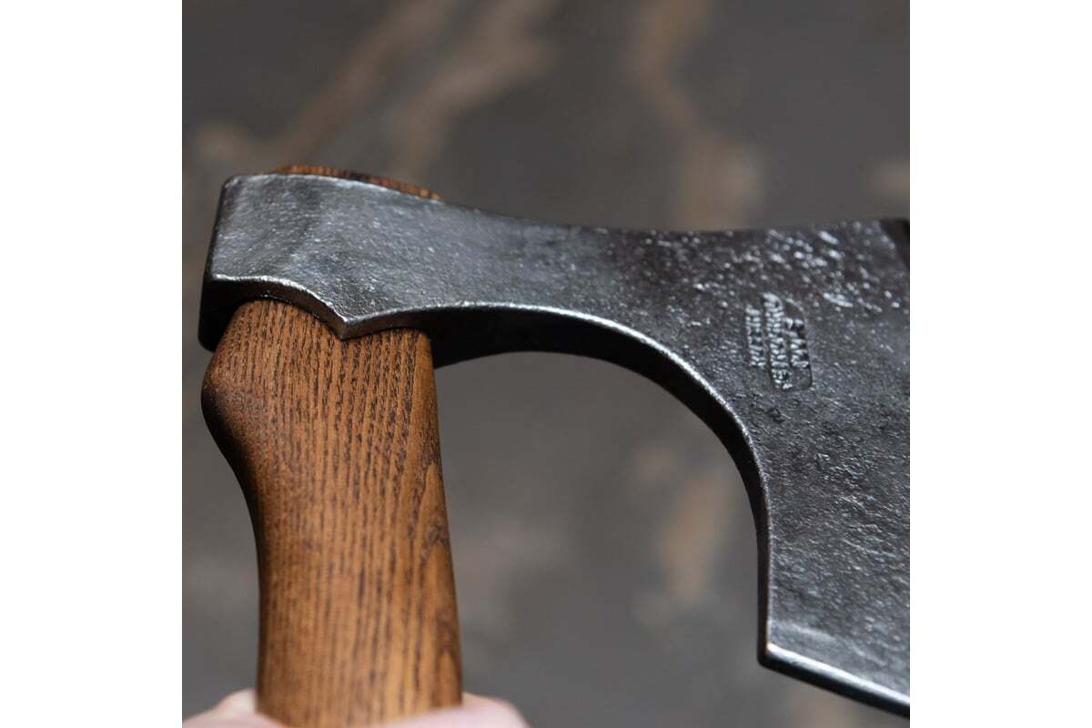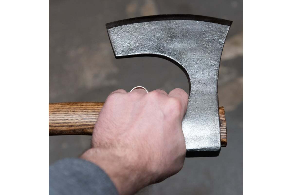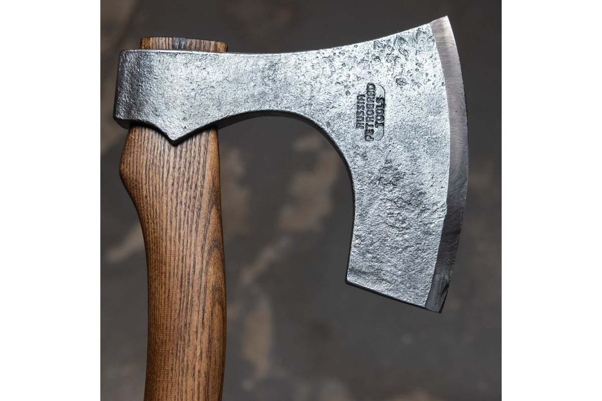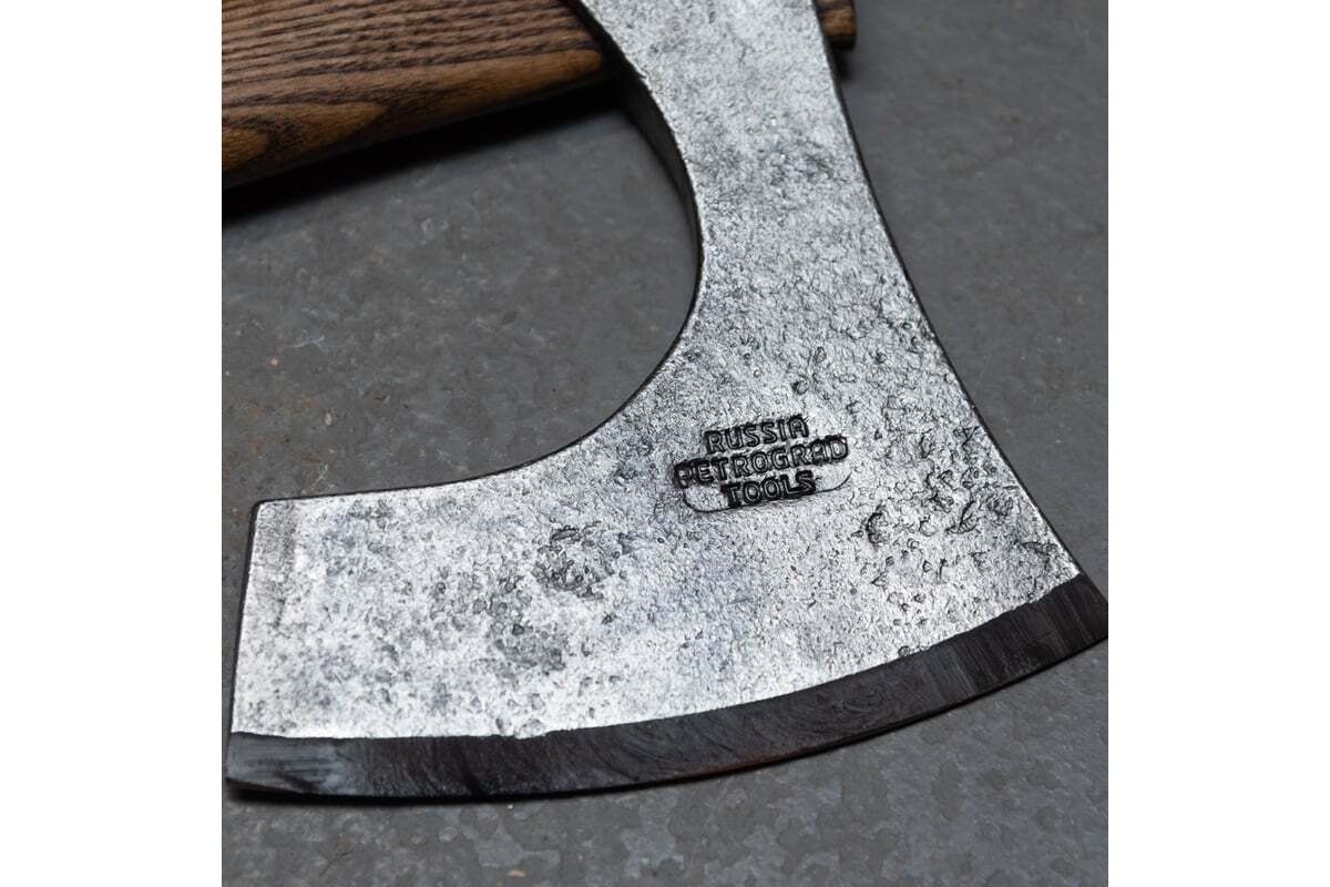 Кованый топор Петроградъ Рославль 10, топорище н11 М00016909 отличается от других топоров удлиненной режущей кромкой. Благодаря этой особенности топор можно брать близким к полотну хватом и не бояться поранить руку при работе. Такой хват очень удобен при тёске и ошкуривании бревен. Удлиненная рукоять позволяет без лишних усилий рубить ветки, сучья и небольшие деревья.