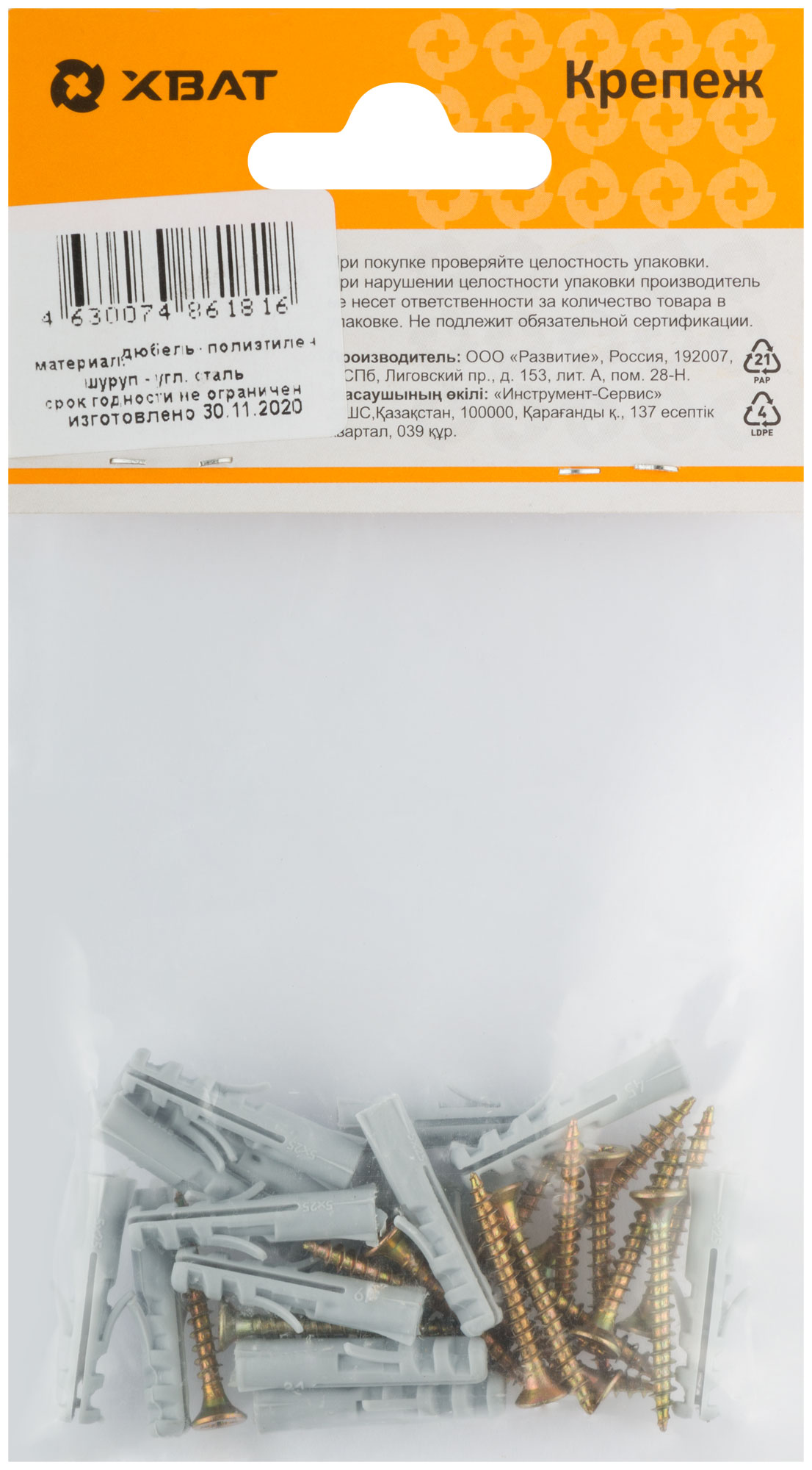 Дюбель изготовлен из полипропилена, шуруп - из стали. Используется для крепления плинтусов и других конструкций.