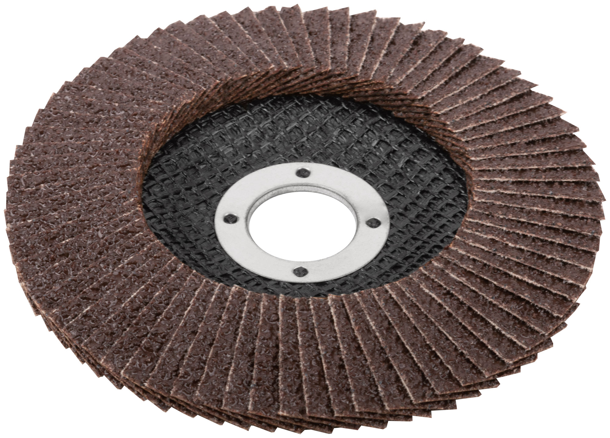 Предназначен для УШМ, посадка 22,23 мм. Наполняемость круга 72 лепестка (28x17мм) с углом наклона 10 градусов, что позволяет увеличить площадь контакта с поверхностью. Используется для обработки различных поверхностей: металл, дерево, пластик. Материал: инструментальная сталь, тканевая основа, абразивный материал.