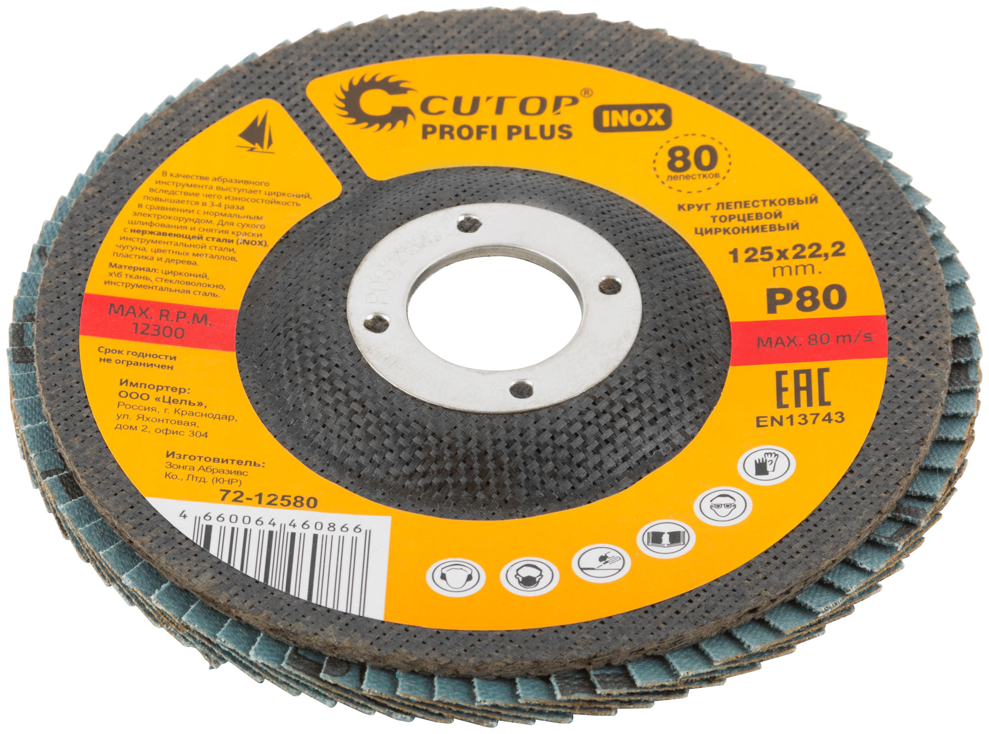 При изготовлении используется высококачественный гибкий абразивный материал состоящий из тканевой основы на которую нанесен слой циркониевого электрокорунда. Круги на основе циркониевого электрокорунда имеют высокую прочность, коэффициент шлифования на кругах данного типа выше в несколько раз, чем у кругов на основе нормального электрокорунда, что особенно эффективно при работе с особо твёрдыми сортами металла. Структура циркониевого электрокорунда даёт эффект самозатачивания, что также увеличивает ресурс использования. Наполняемость диска составляет 80 лепестков с углом наклона 10 градусов, это позволяет увеличить КПД круга и его стойкость к износу в несколько раз. Предназначен для обработки нержавеющей стали, металла, сварных швов, пластика, дерева. Для углошлифовальных машин. Посадочный диаметр 22,2мм.