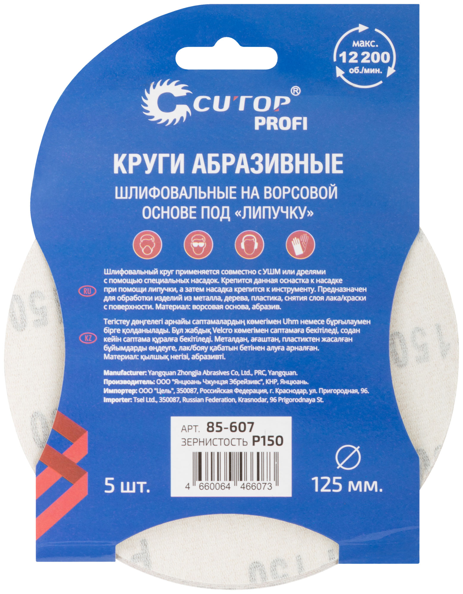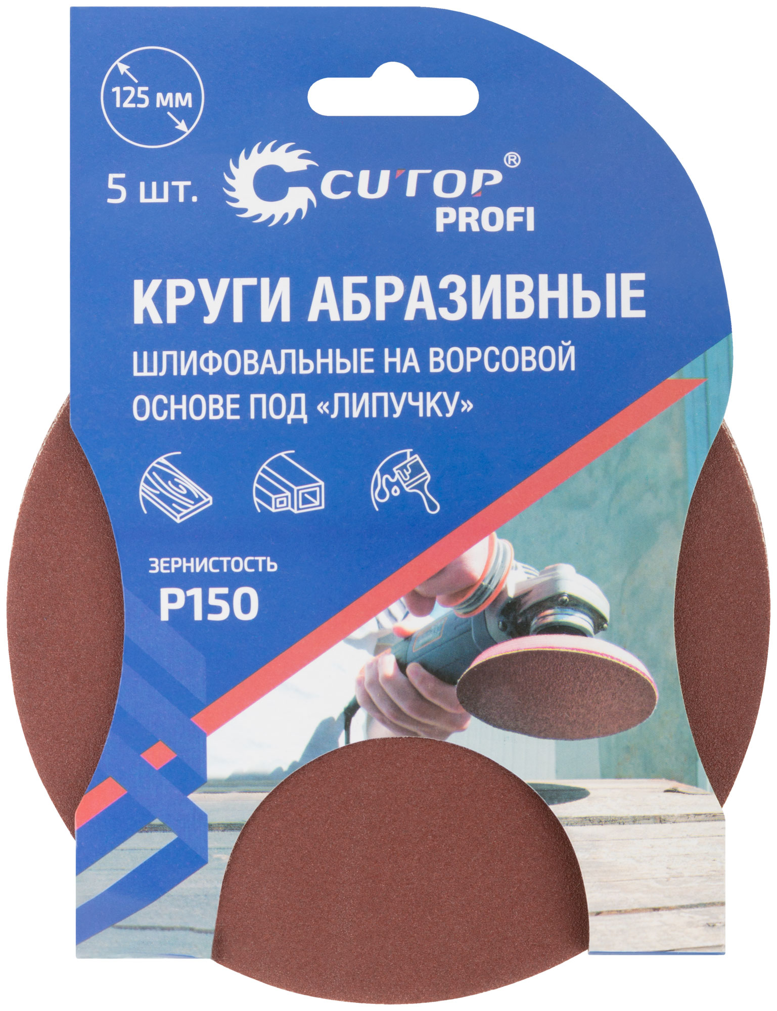 Круги абразивные шлифовальные на ворсовой основе под "липучку" ( Р150, 125 мм, 5шт.), Cutop Profi