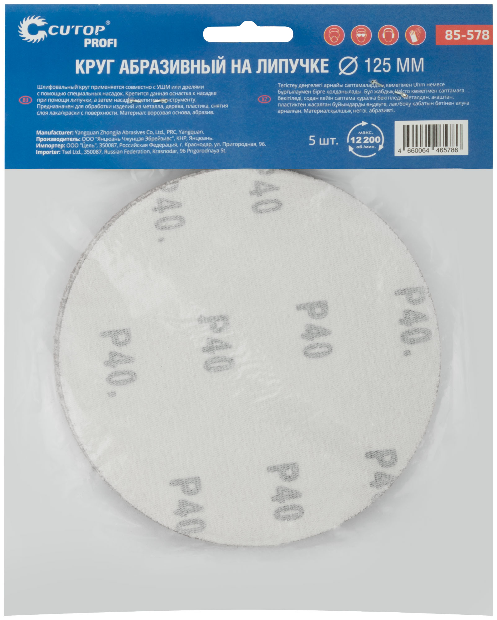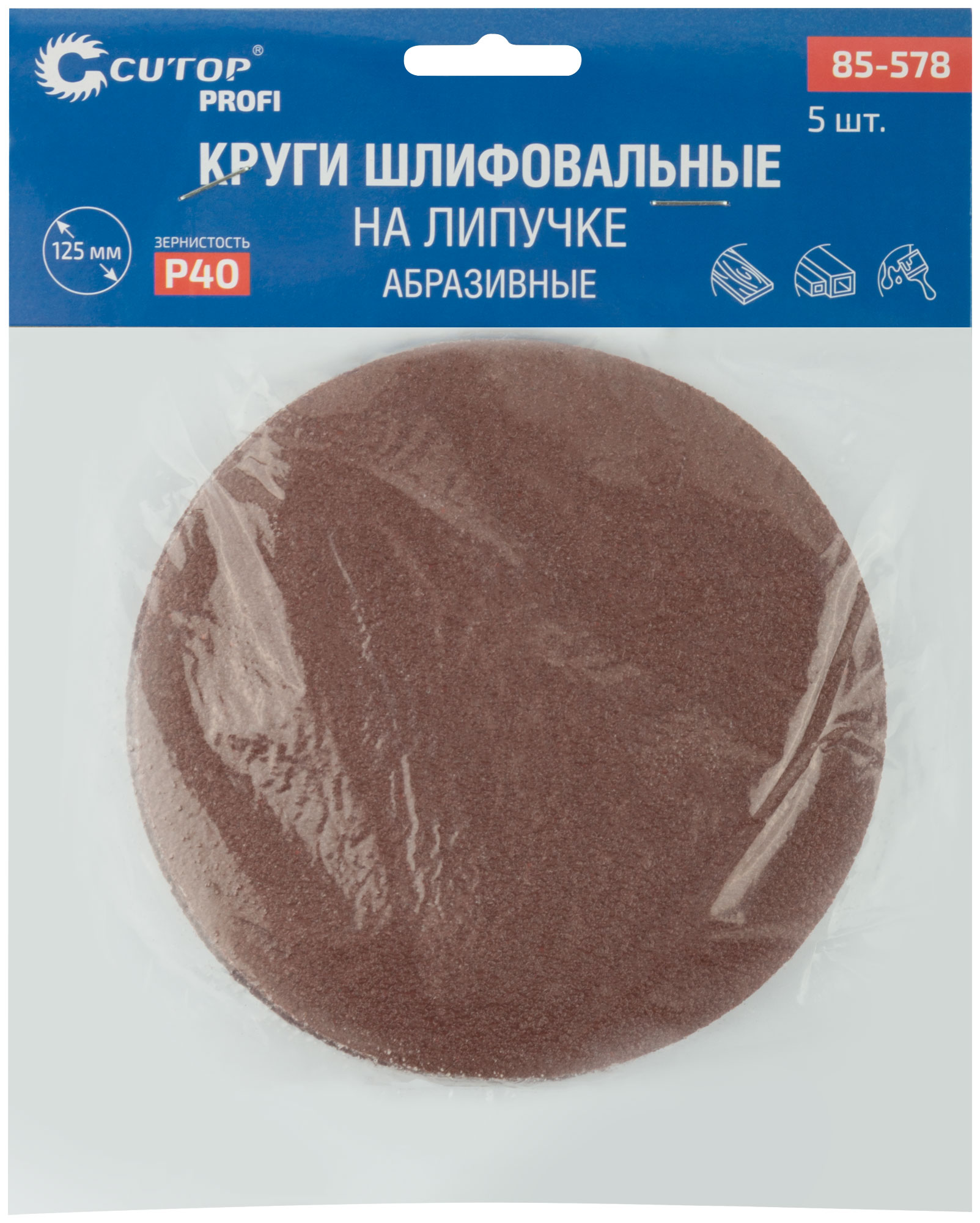 Круги абразивные шлифовальные на ворсовой основе под "липучку" ( Р40, 125 мм, 5шт.), Cutop Profi
