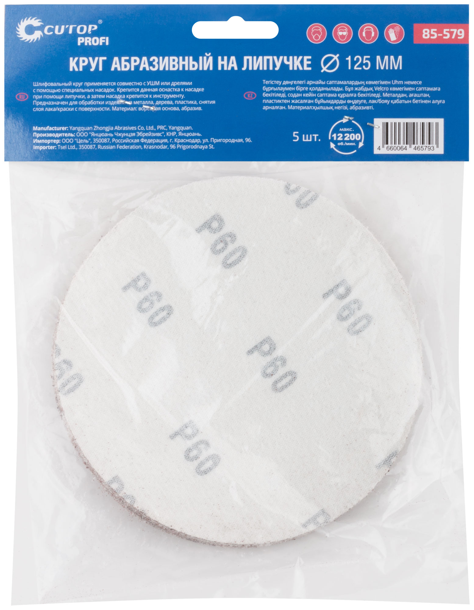 Круги абразивные шлифовальные на ворсовой основе под "липучку" ( Р60, 125 мм, 5шт.), Cutop Profi