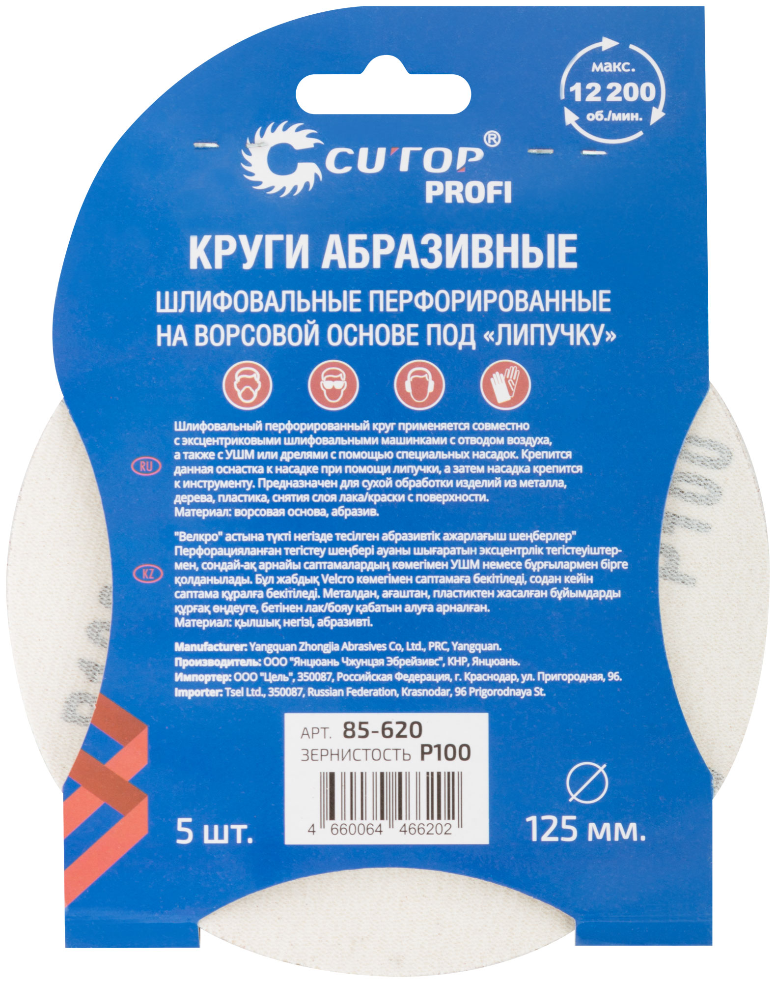 Круги абразивные шлифовальные перфорированные на ворсовой основе под "липучку" (Р100, 125 мм, 5шт.), CUTOP Profi