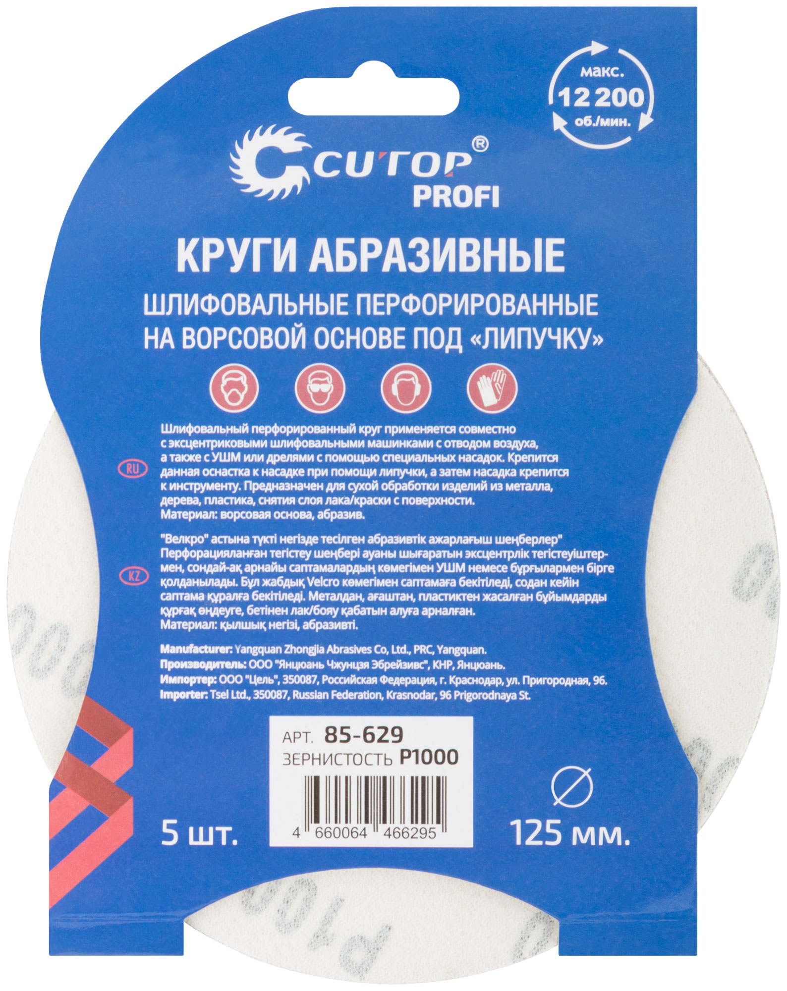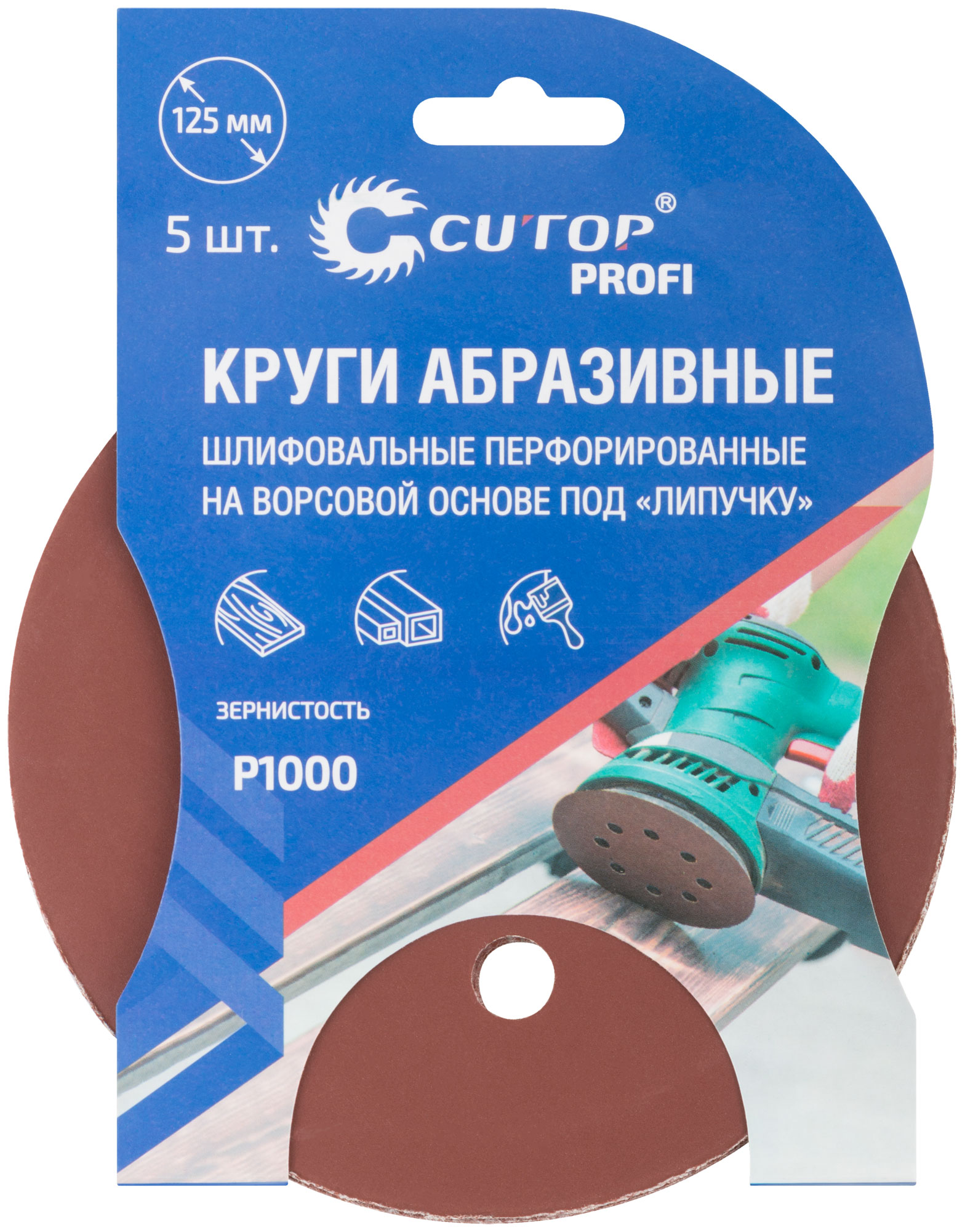 Круги абразивные шлифовальные перфорированные на ворсовой основе под "липучку" (Р1000, 125 мм, 5шт.), CUTOP Profi