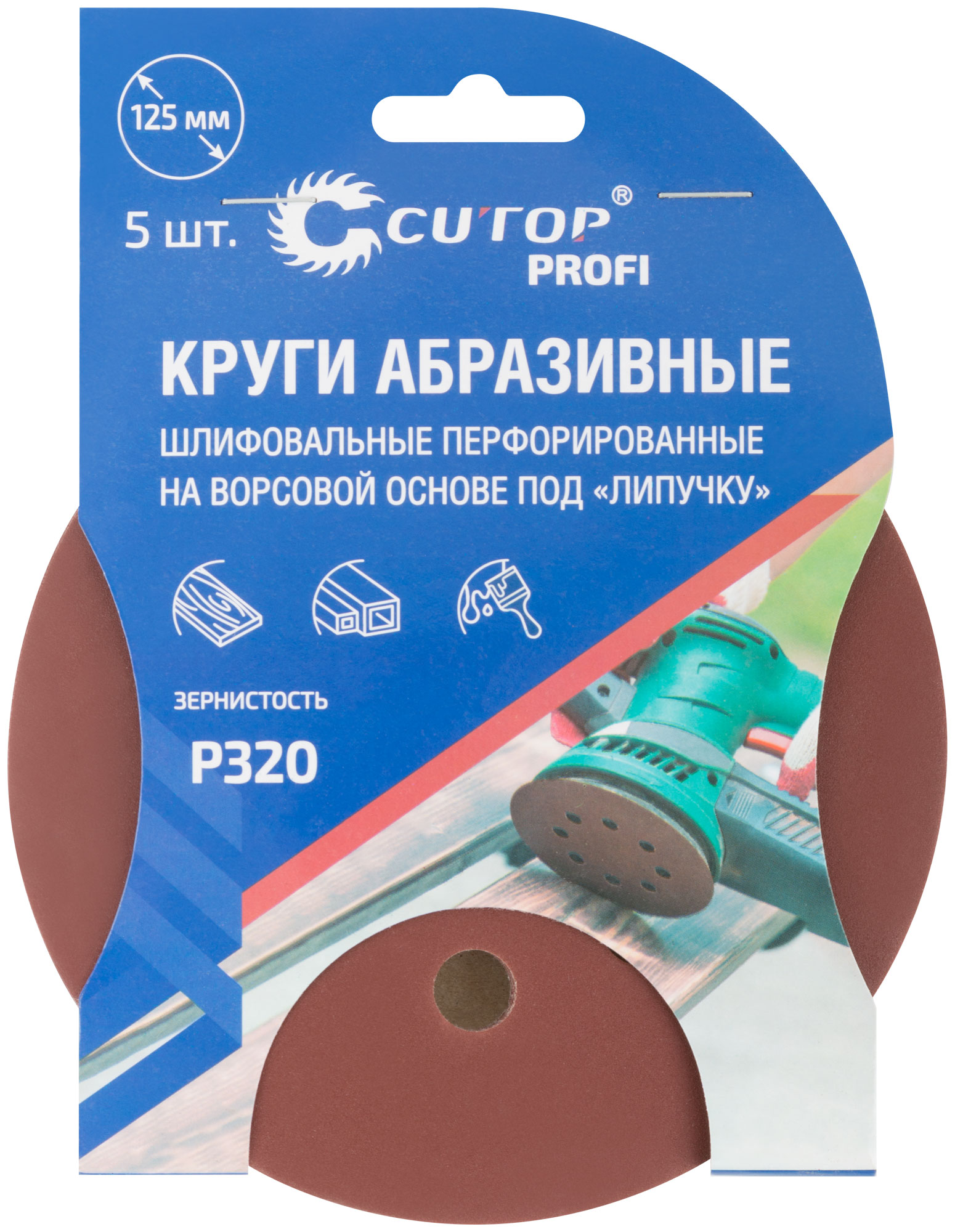 Круги абразивные шлифовальные перфорированные на ворсовой основе под "липучку" (Р320, 125 мм, 5шт.), CUTOP Profi