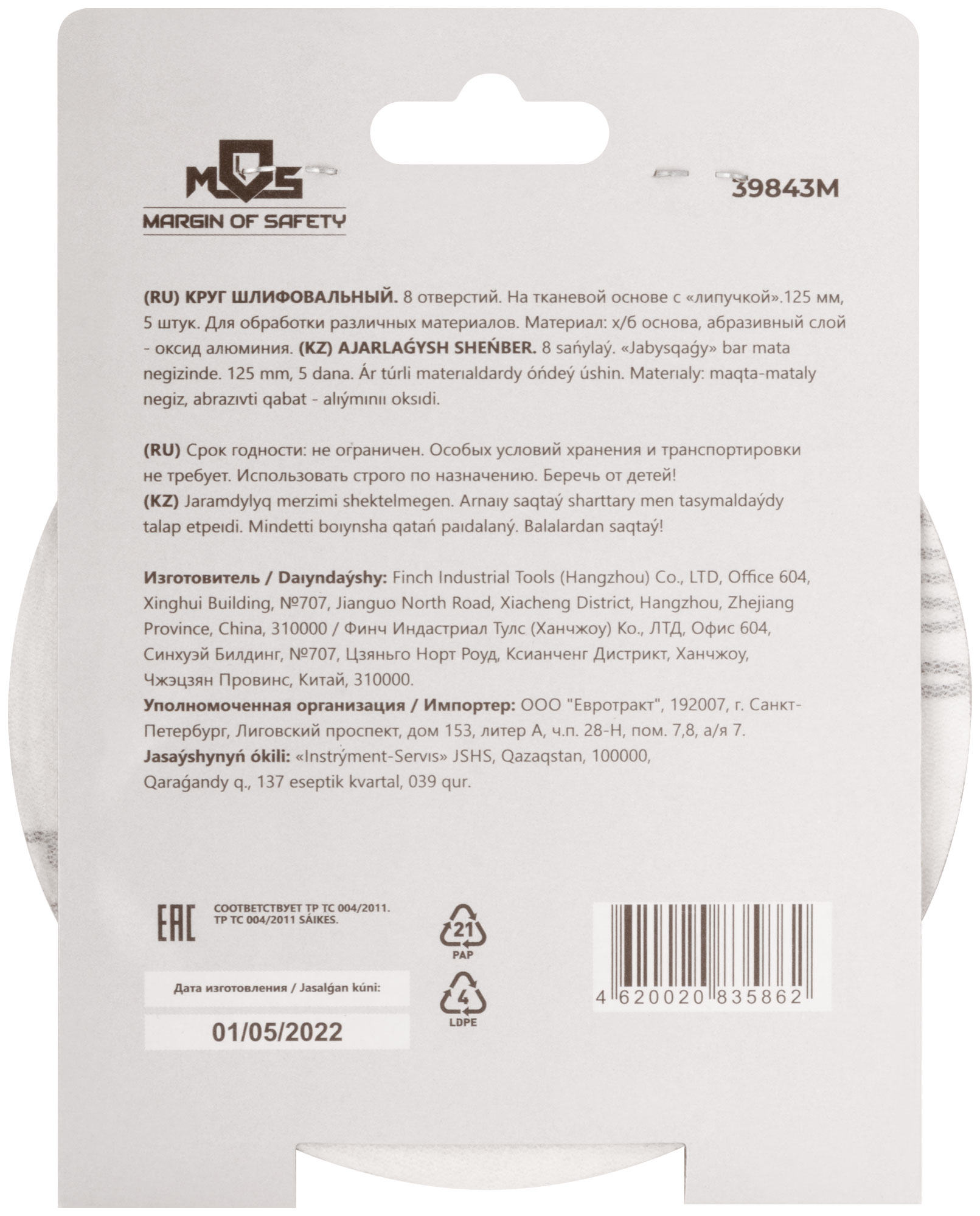 8 отверстий. На тканевой основе с «липучкой». Диаметр 125 мм, набор 5 шт. Для обработки различных материалов. Материал: х/б основа, абразивный слой - оксид алюминия.