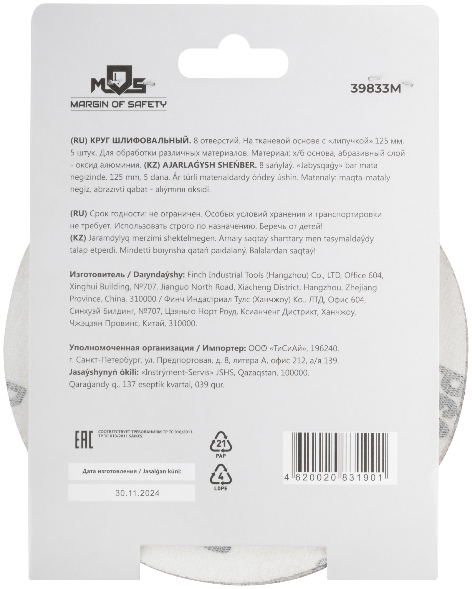 8 отверстий. На тканевой основе с «липучкой». Диаметр 125 мм, набор 5 шт. Для обработки различных материалов. Материал: х/б основа, абразивный слой - оксид алюминия.