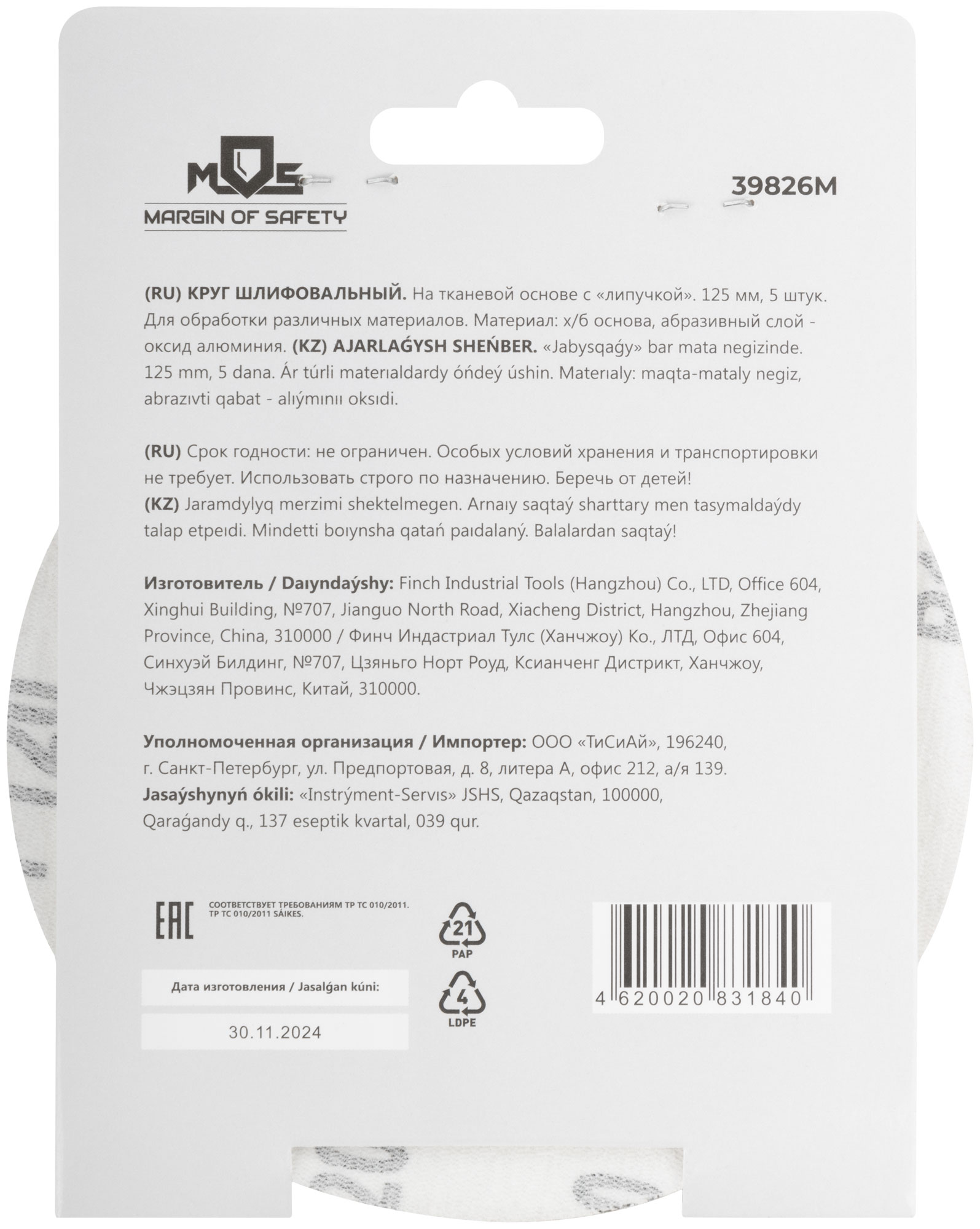 На тканевой основе с "липучкой". Диаметр 125 мм, набор 5 шт. Для обработки различных метериалов. Материал: х/б основа, образивный слой-оксид алюминия.