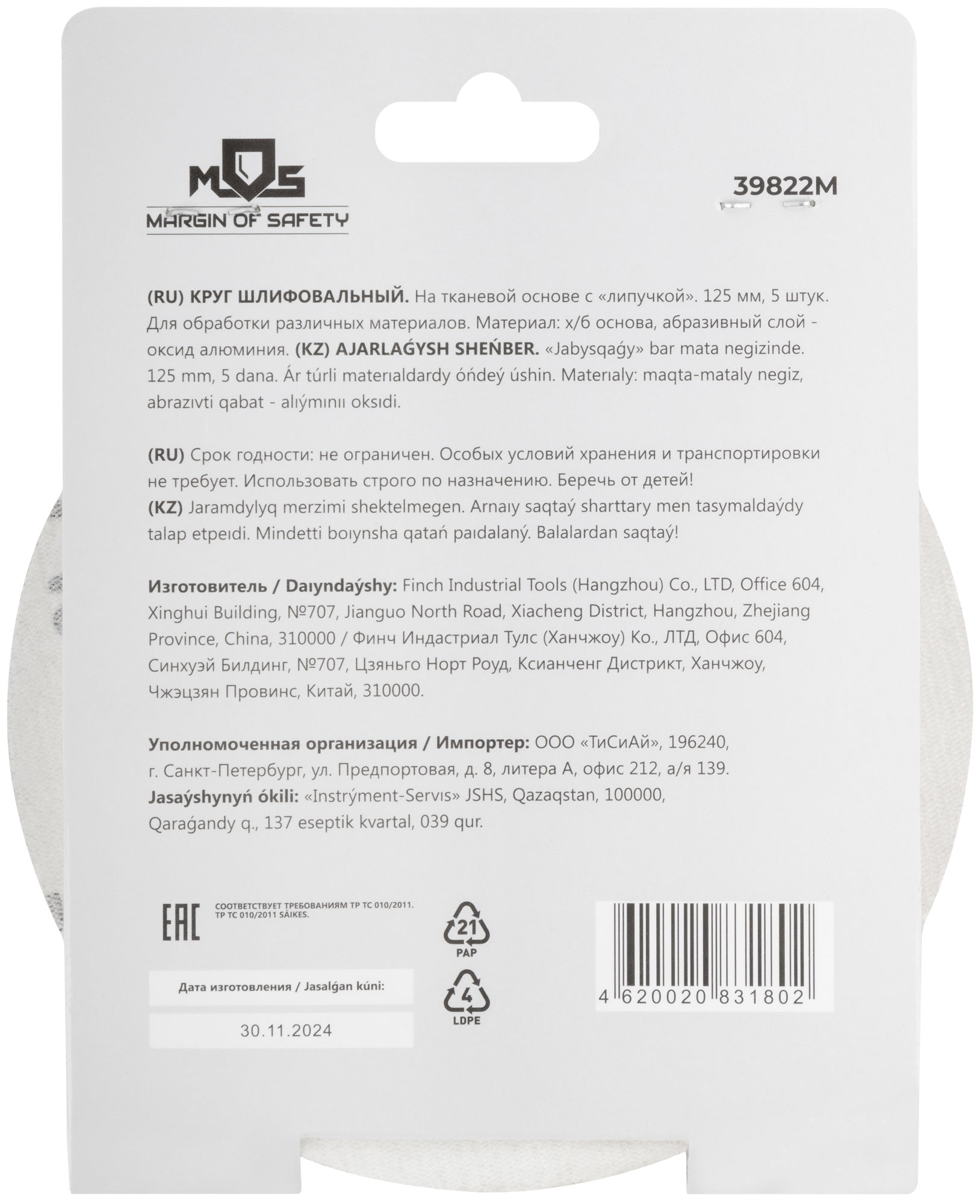 На тканевой основе с "липучкой". Диаметр 125 мм, набор 5 шт. Для обработки различных метериалов. Материал: х/б основа, образивный слой-оксид алюминия.