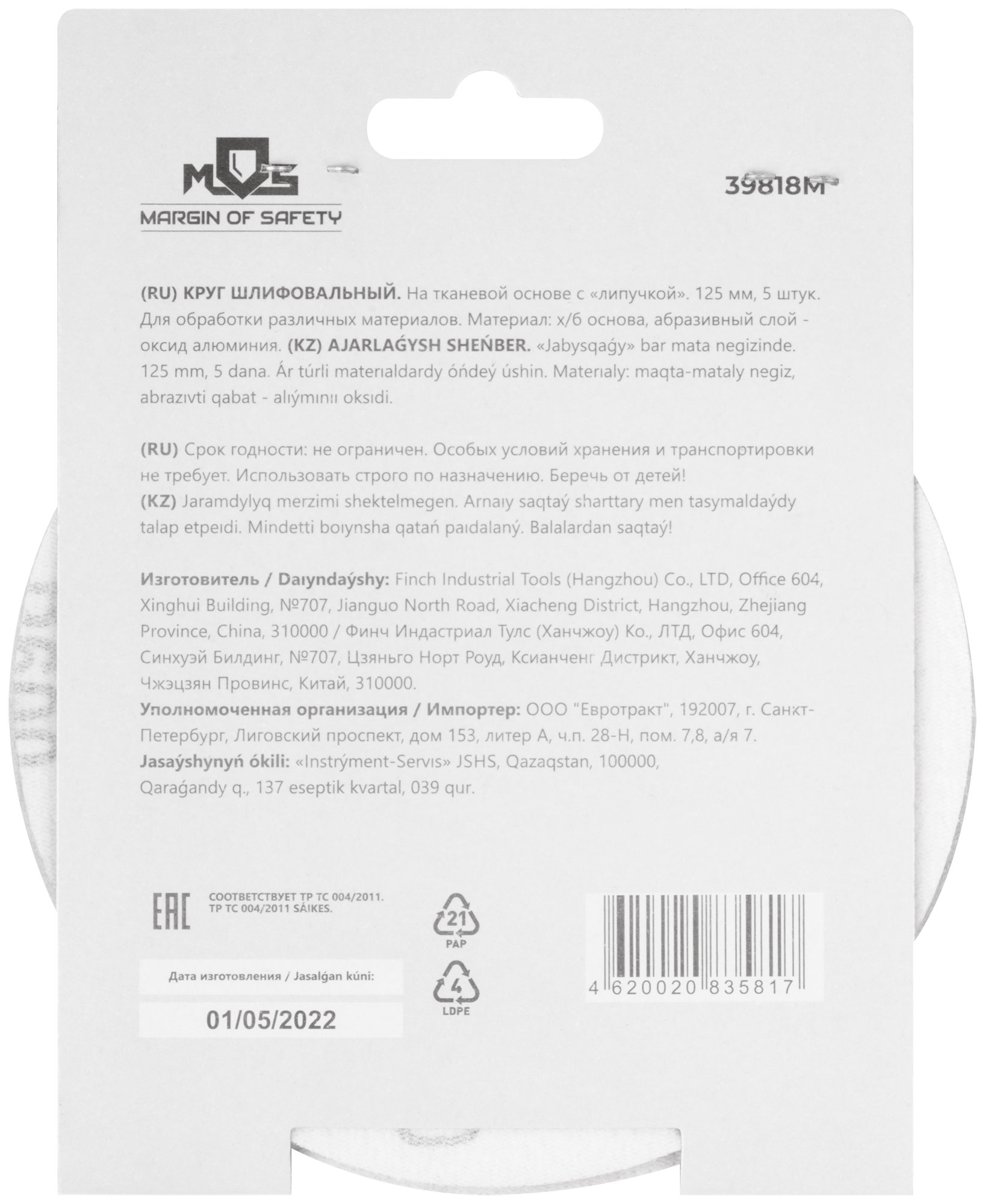 На тканевой основе с "липучкой". Диаметр 125 мм, набор 5 шт. Для обработки различных метериалов. Материал: х/б основа, образивный слой-оксид алюминия.