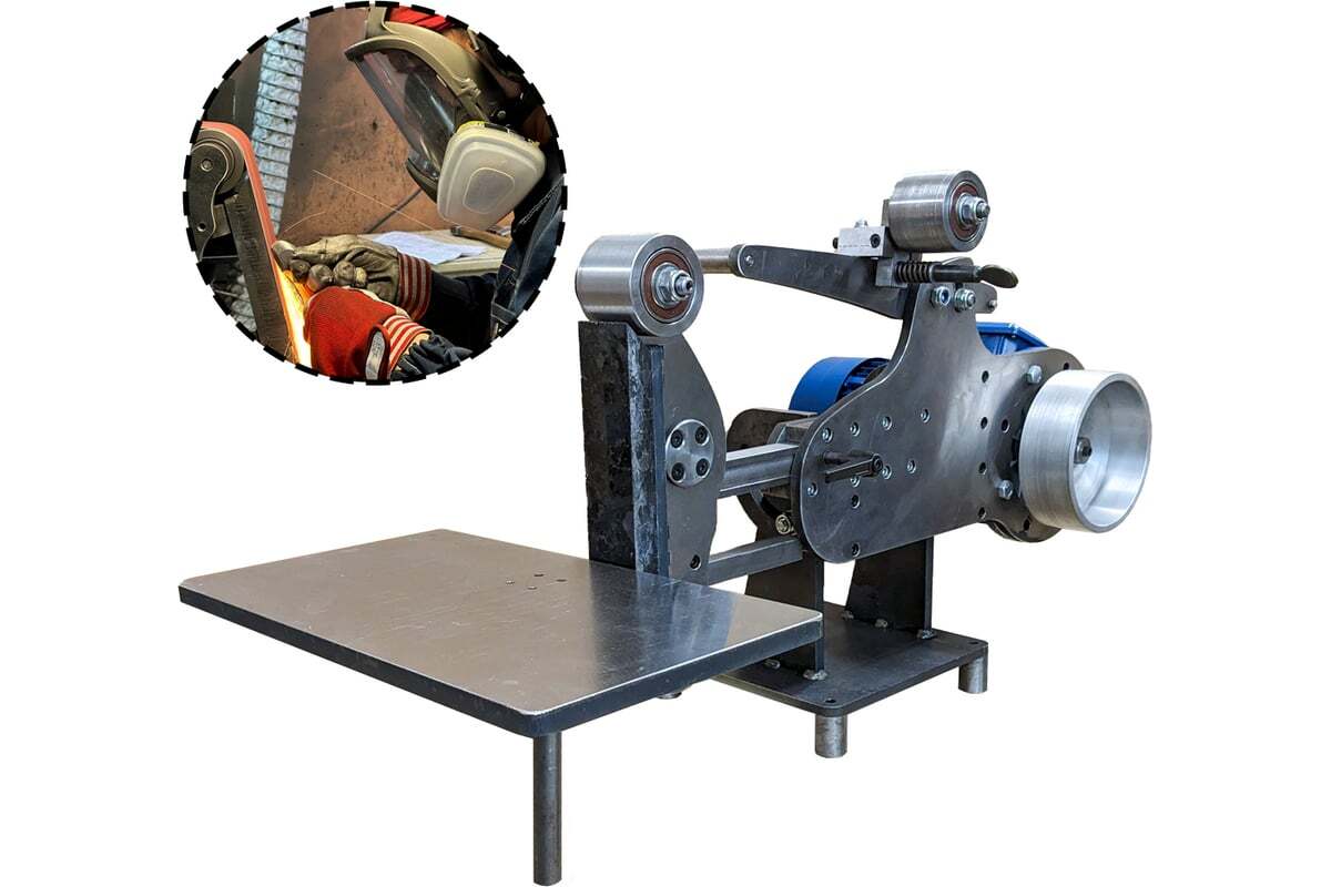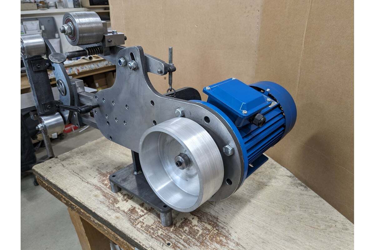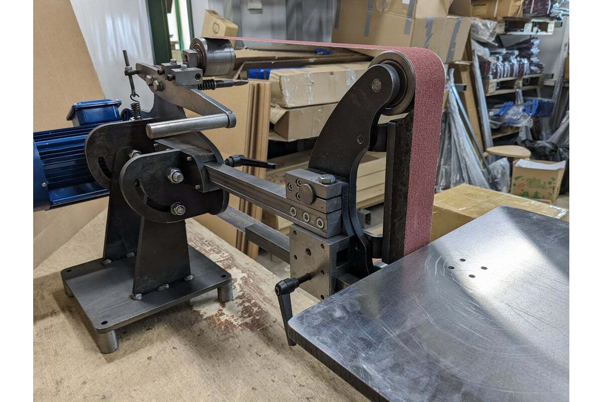 За счет использования толстого металла получается жесткая и надежная конструкция. Ролики стальные, приводной шкив алюминиевый для уменьшения инерционного сопротивления при пуске и останове, что позволяет быстрее выйти на рабочую скорость или завершить работу. Двигатель мощностью 2,2 кВт позволяет эффективно и быстро производить обдирочные работы и другие сложные работы, а частотный преобразователь поможет эффективно подобрать необходимую скорость под каждый материал.
