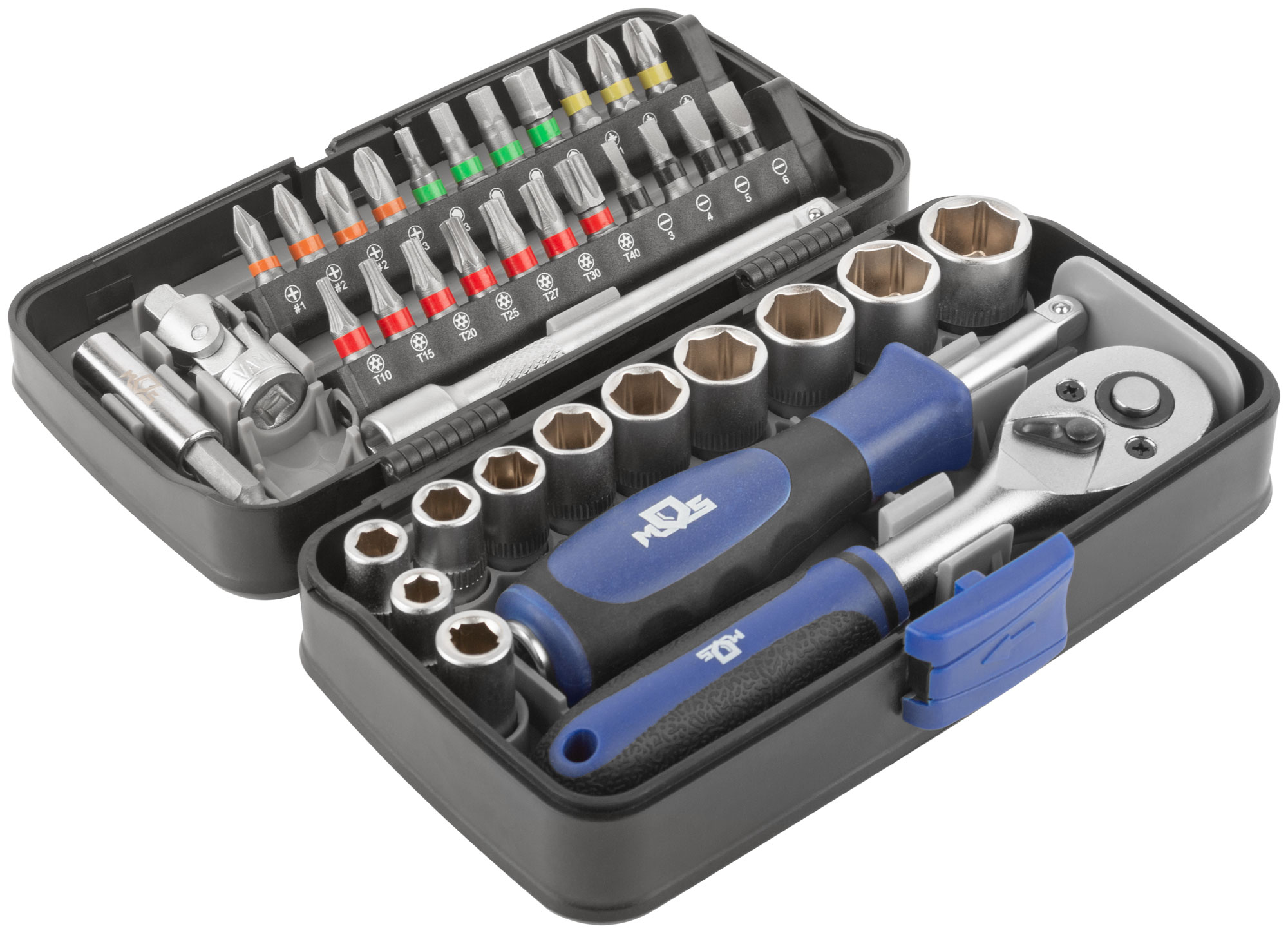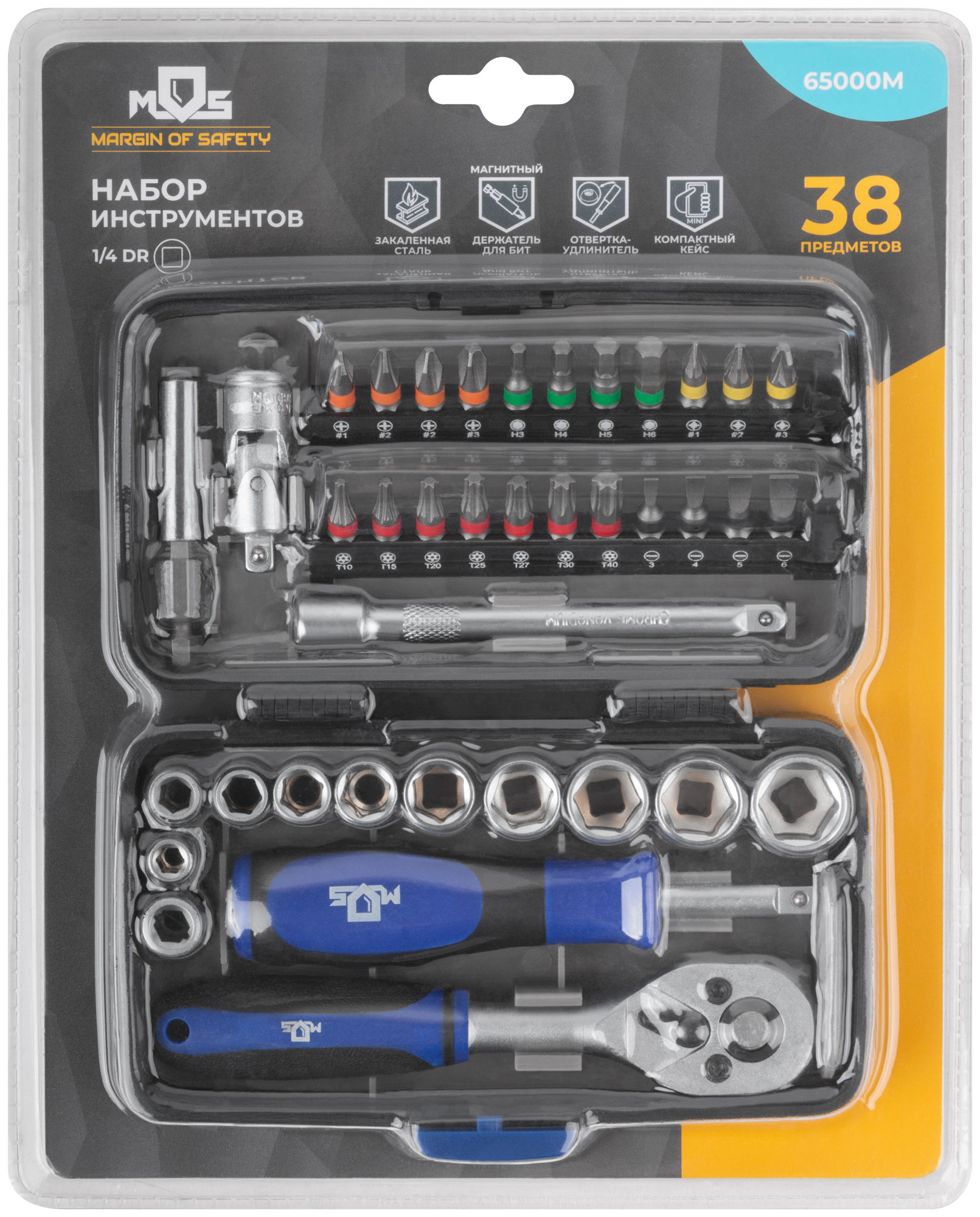 Мини-набор инструмента (биты, головки, вороток, удлинитель), 38 шт., пластиковый кейс