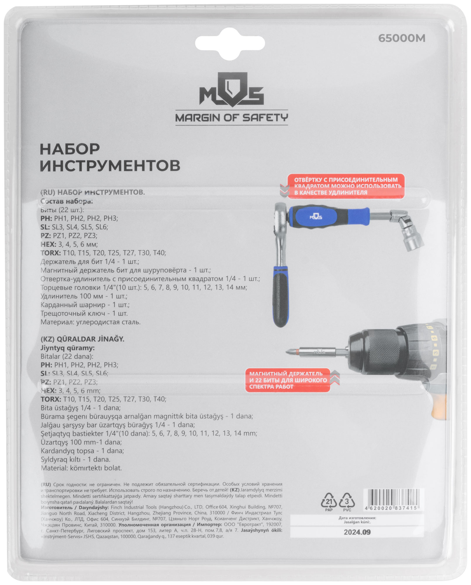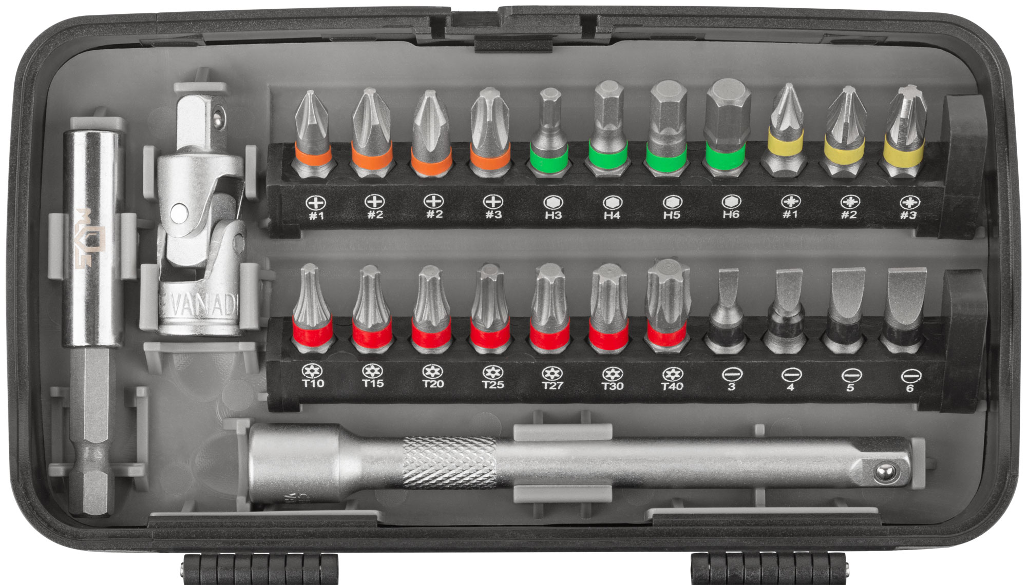 Мини-набор инструмента. Состав: Биты (22 шт.): PH: PH1, PH2, PH2, PH3; SL: SL3, SL4, SL5, SL6; PZ: PZ1, PZ2, PZ3; HEX - 3, 4, 5, 6 мм; TORX - Т10, Т15, Т20, Т25, Т27, Т30, Т40. Держатель для бит 1/4˝ - 1 шт.; Магнитный держатель бит для шуруповёрта - 1 шт.; Отвертка-удлинитель с присоединительным квадратом 1/4˝ - 1 шт; Торцевые головки 1/4˝ (10 шт.): 5, 6, 7, 8, 9, 10, 11, 12, 13, 14 мм; Удлинитель 100 мм - 1 шт.; Карданный шарнир - 1 шт.; Трещоточный ключ 1/4˝ (45 зубьев) - 1 шт. Материал: углеродистая сталь.Упаковка: пластиковый кейс, коробка с подвесом.