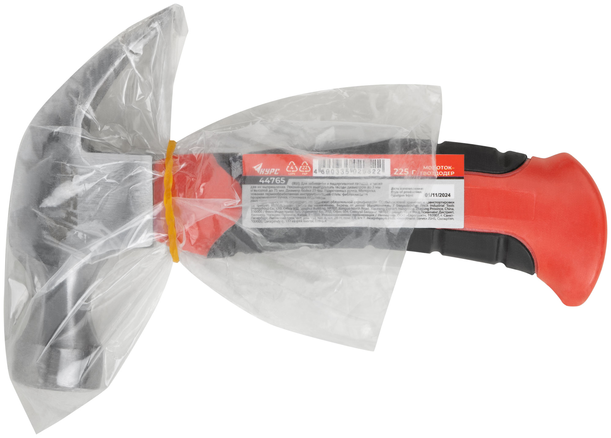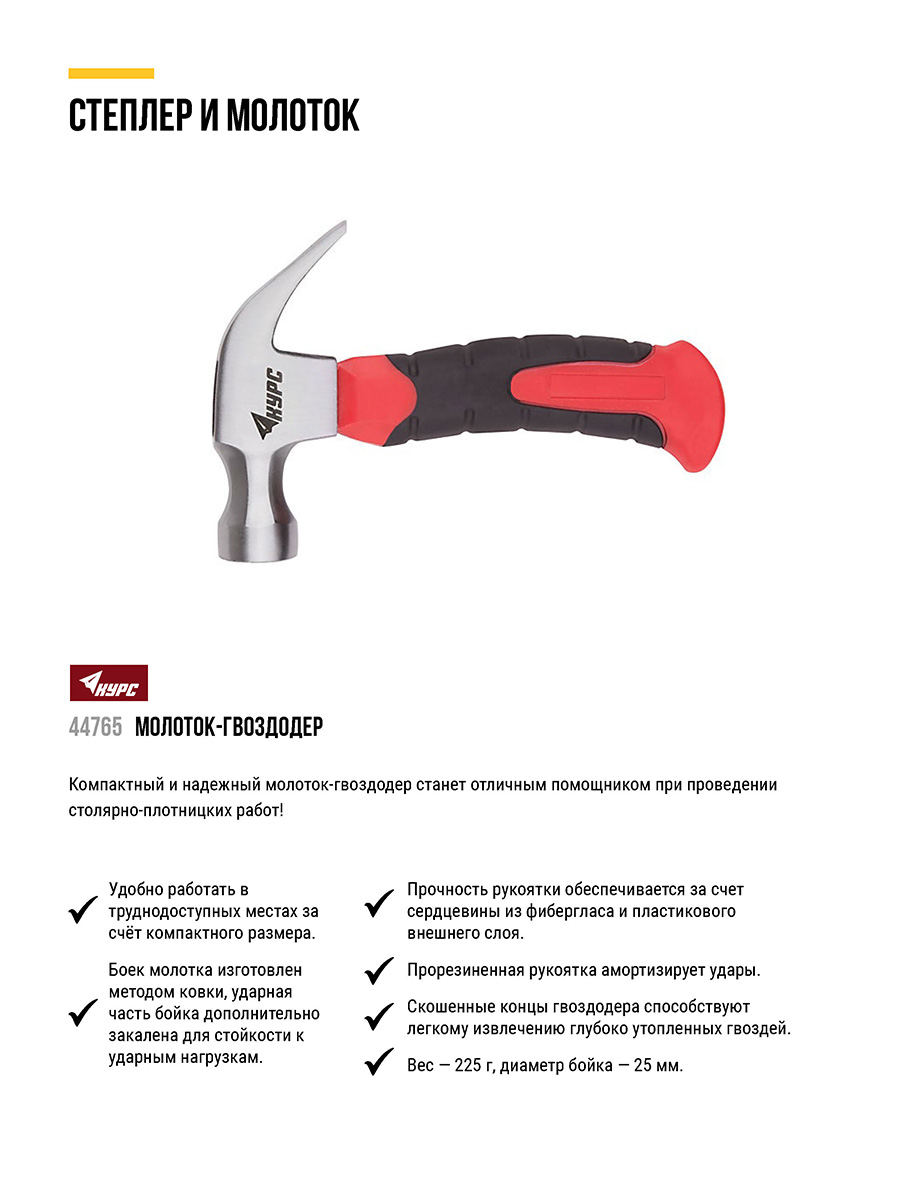 Молоток-гвоздодер укороченный, фиберглассовая обрезиненная ручка, 25 мм, 225 гр.