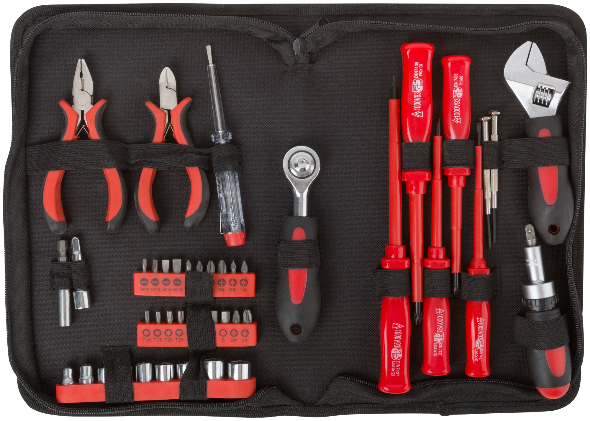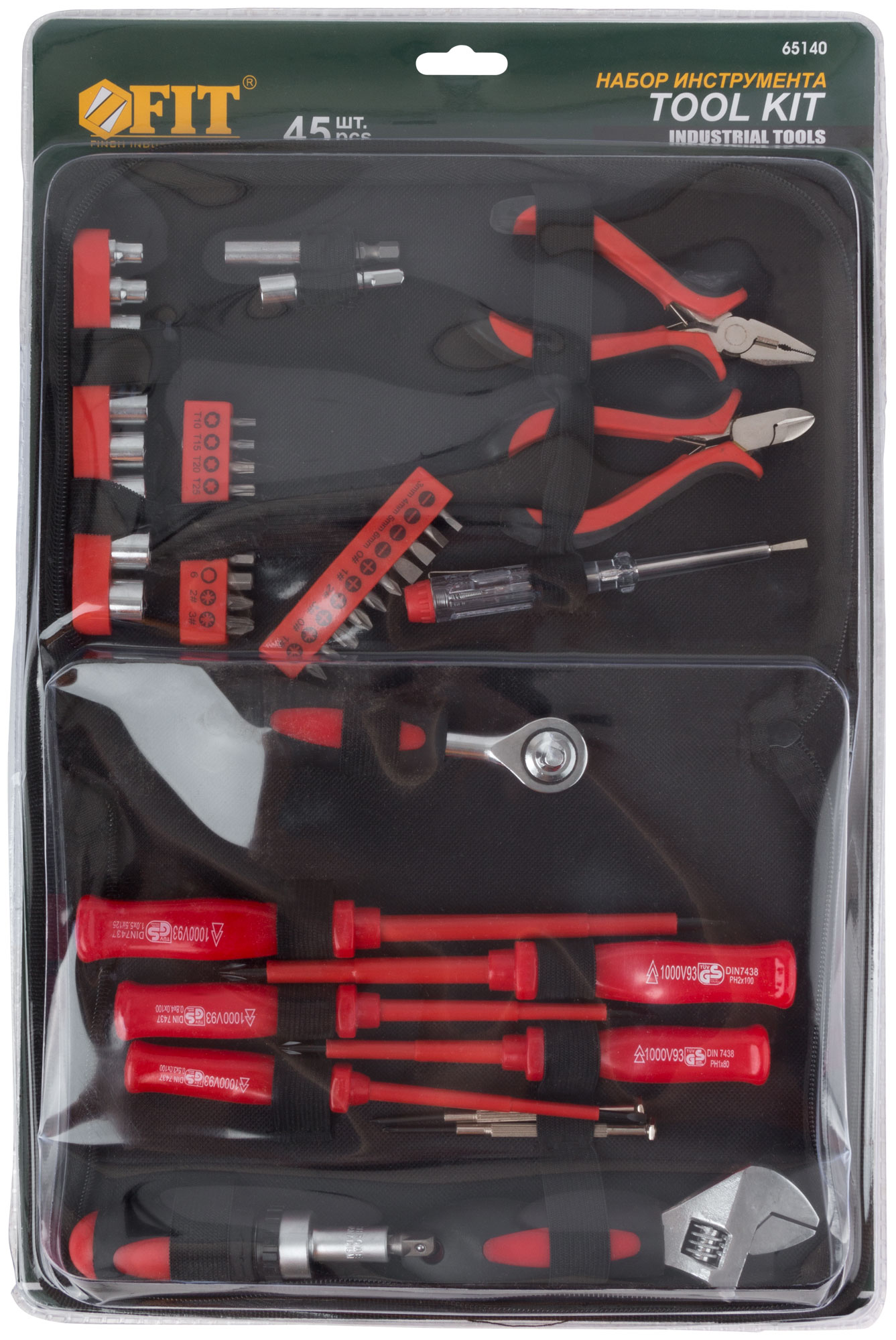 Отвёртки, вороток, ключ разводной, адаптер для головок, удлинители, пассатижи, бокорезы, 9 торцевых головок, биты, нейлоновая сумка. Материал: термообработанная хром-ванадиевая сталь. Упаковка: матерчатый чехол.