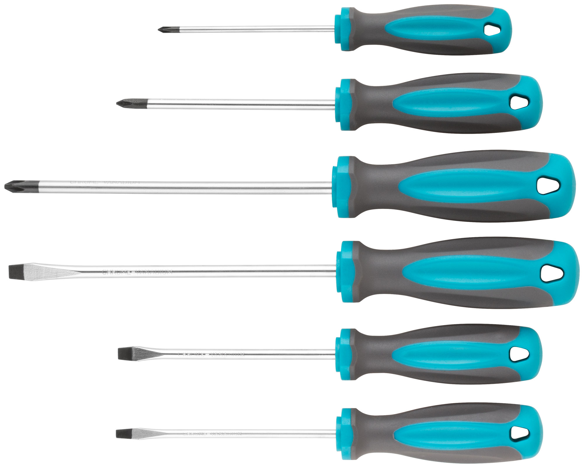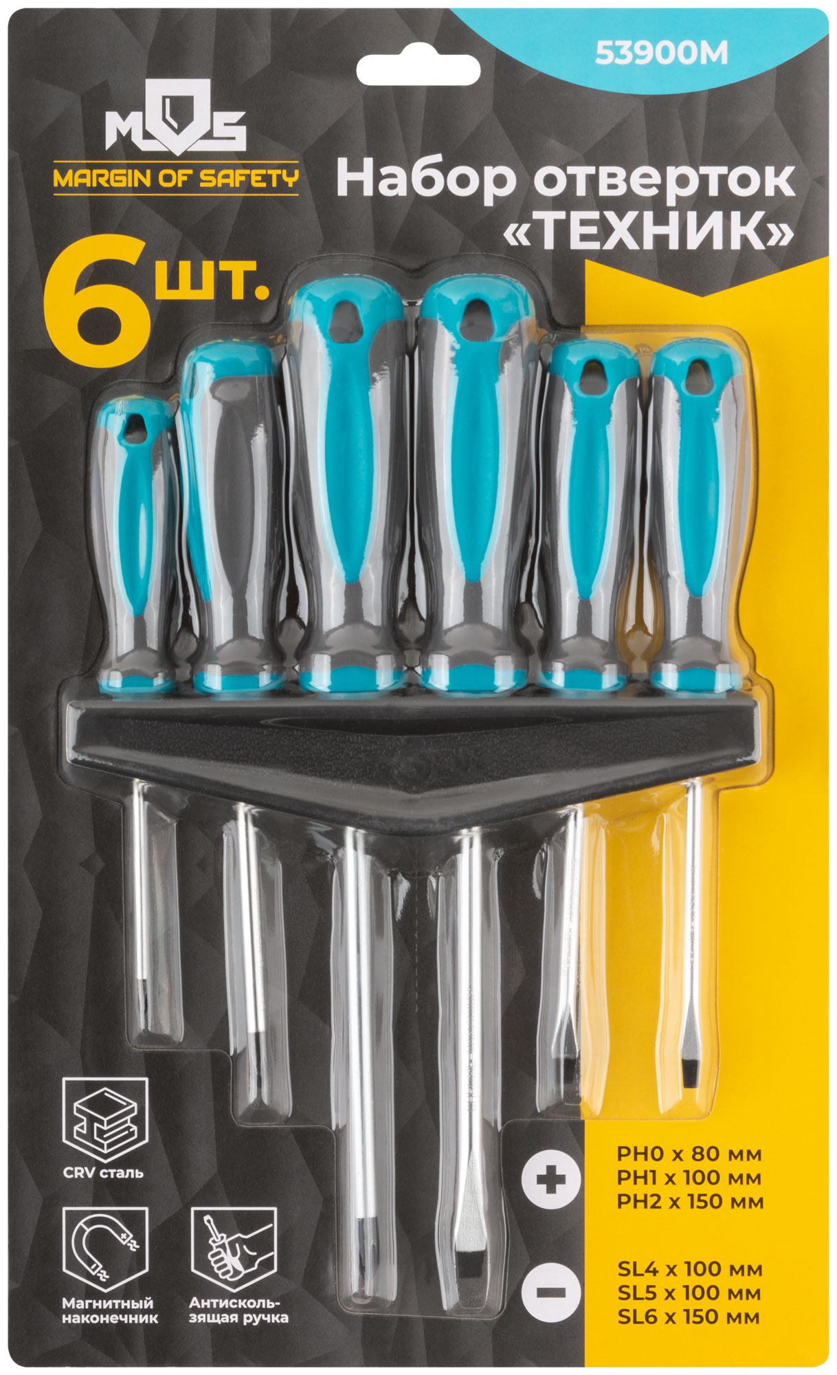 «Техник». PH0 x 80 мм, PH1 x 100 мм, PH2 x 150 мм, SL4 x 100 мм, SL5 x 100 мм, SL6 x 150 мм. На пластиковом держателе. Материал: жало из хром-ванадиевой стали, магнитный наконечник, пластиковая прорезиненная антискользящая ручка. Упаковка: блистер.