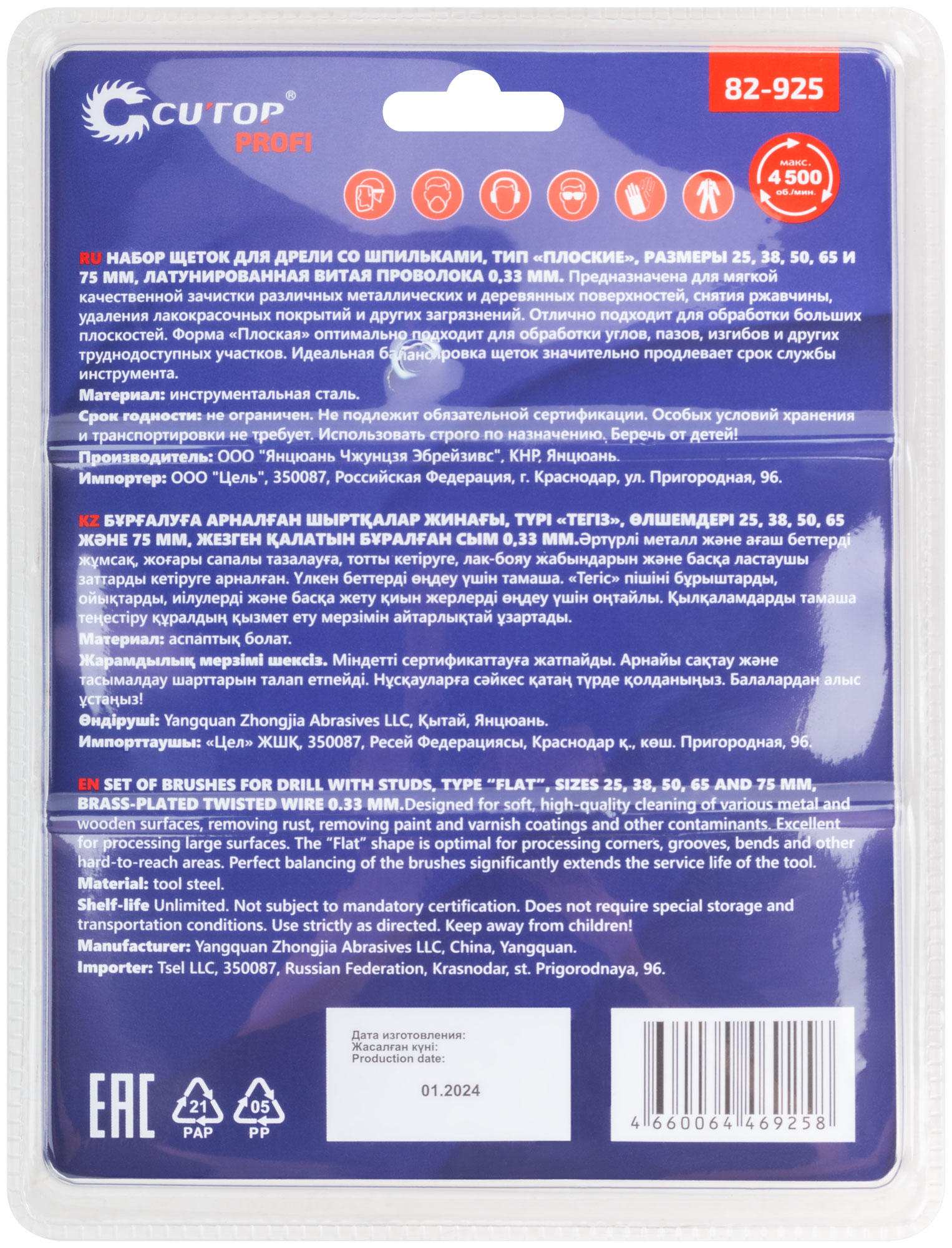 Набор щеток для дрели со шпильками, тип «Плоские», размеры 25, 38, 50, 65 и 75 мм, латунированная витая проволока 0,3 мм, Cutop profi. Предназначена для щадящей очистки различных металлических и деревянных поверхностей, снятия ржавчины, удаления лакокрасочных покрытий и других загрязнений. Тип «Плоская» оптимально подходит для обработки углов, пазов, изгибов и других труднодоступных участков. Упаковка: Блистер.