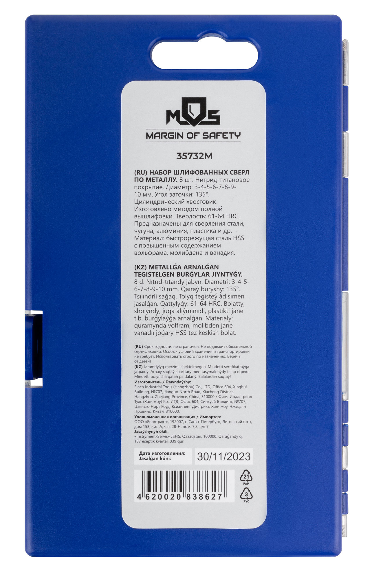 Набор сверл по металлу HSS шлифованные, титановое покрытие, угол заточки 135°, пласт. кейс, 8 шт. (3-4-5-6-7-8-9-10 мм)