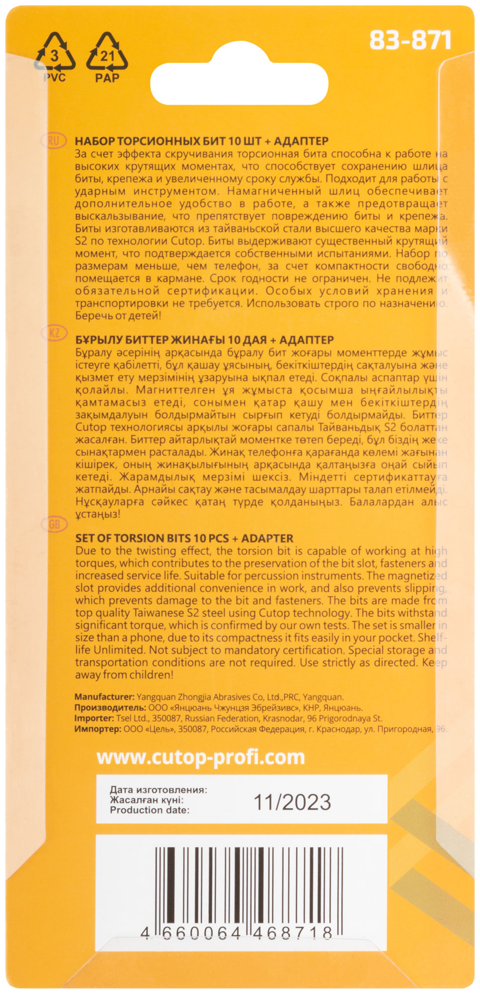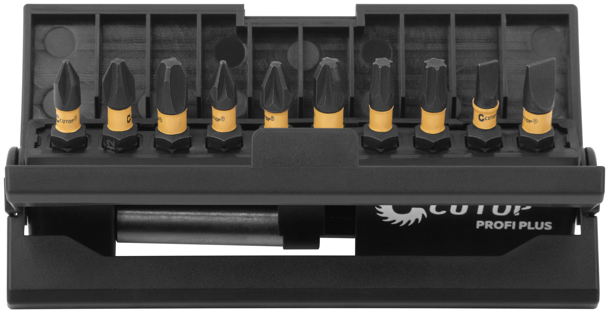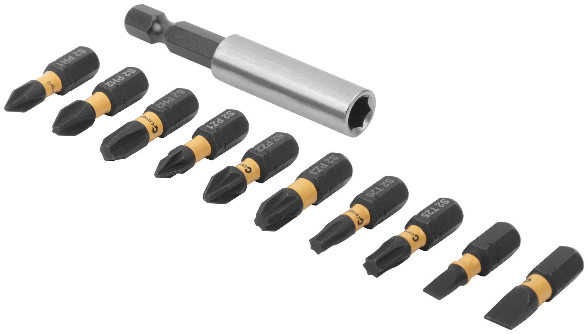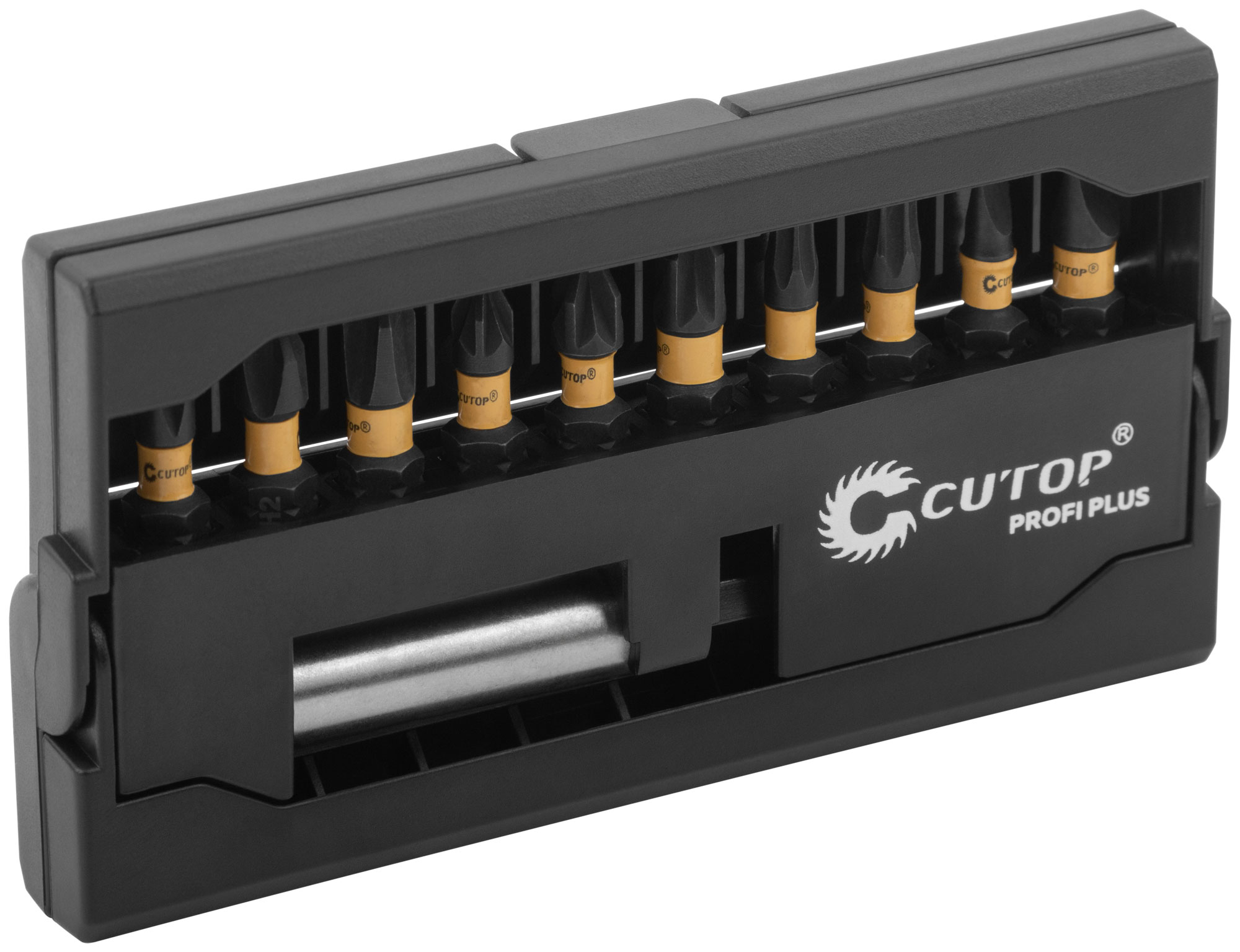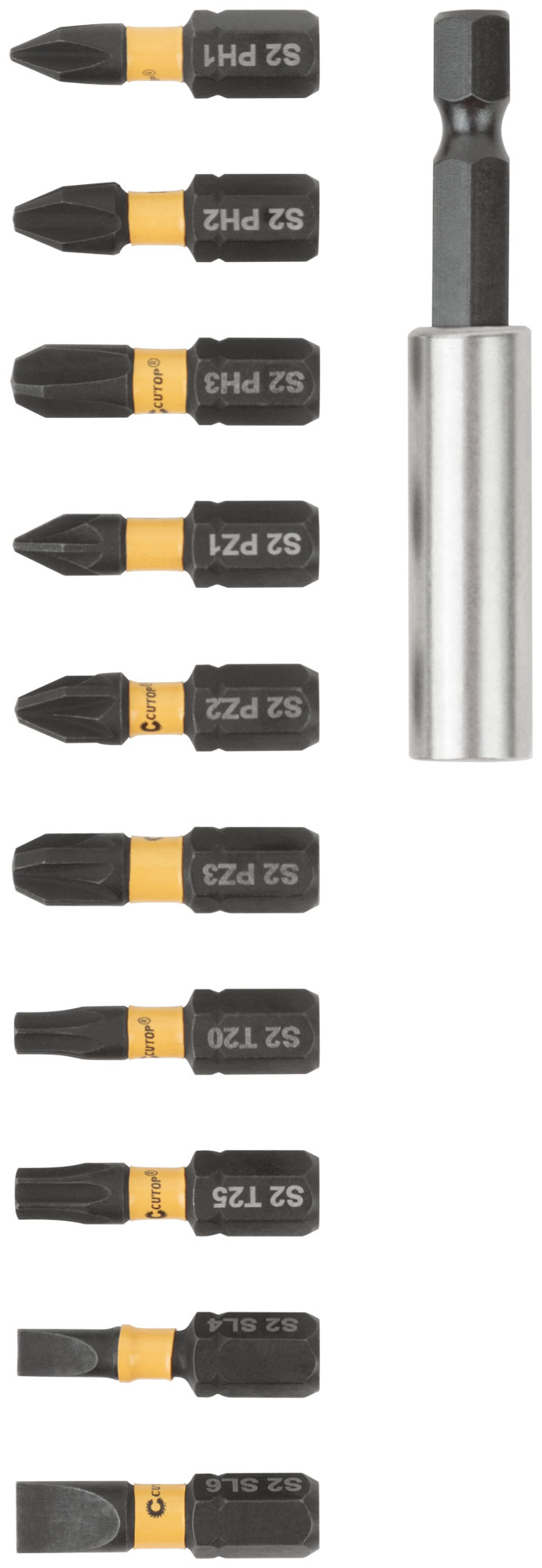 Набор торсионных бит. За счет эффекта скручивания торсионная бита способна к работе на высоких крутящих моментах, что способствует сохранению шлица биты, крепежа и увеличенному сроку службы. Подходит для работы с ударным инструментом. Намагниченный шлиц обеспечивает дополнительное удобство в работе, а также предотвращает выскальзывание, что препятствует повреждению биты и крепежа. Биты изготавливаются из тайваньской стали высшего качества марки S2 по технологии Cutop, что обеспечивает увеличенный срок службы. Биты выдерживают существенный крутящий момент, что подтверждается собственными испытаниями. Набор по размерам меньше, чем телефон. За счет компактности свободно помещается в кармане.Торсионных бит 25 мм 10 шт: PH1, PH2, PH3, PZ1, PZ2, PZ3, T20, Т25, SL4, SL6. Адаптер для бит, с магнитным держ-лем 1 шт.