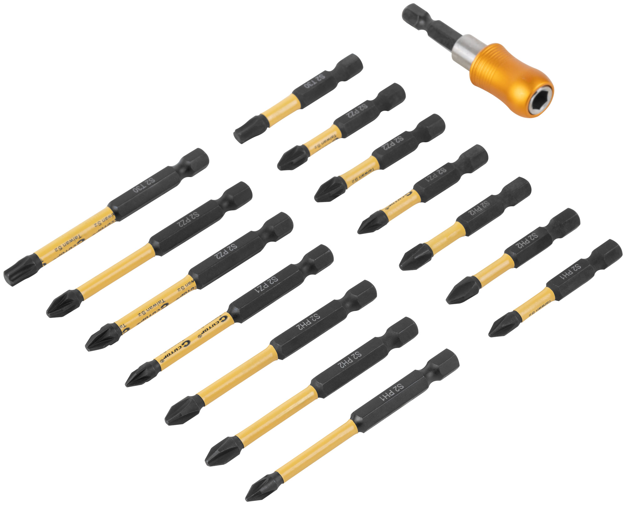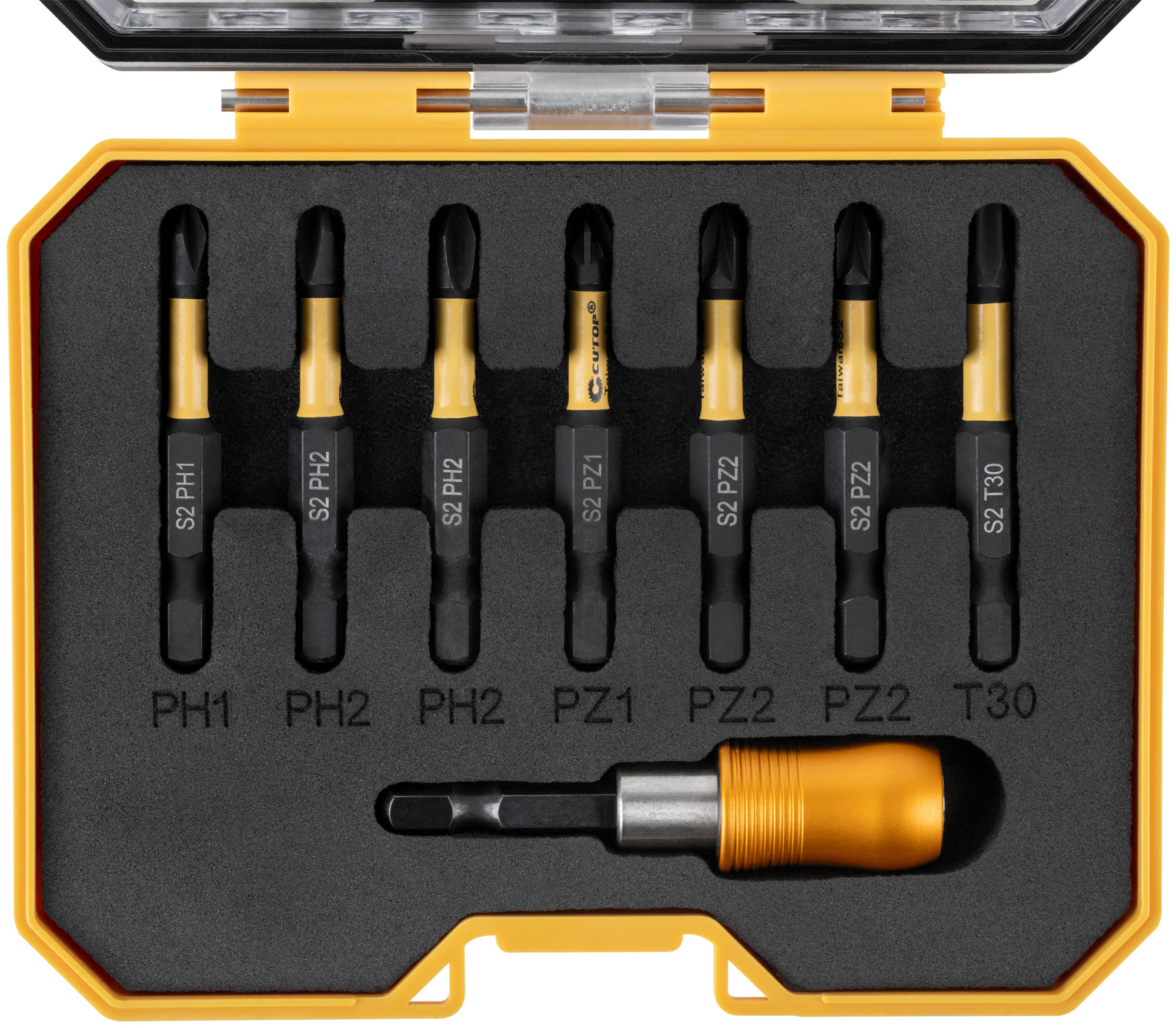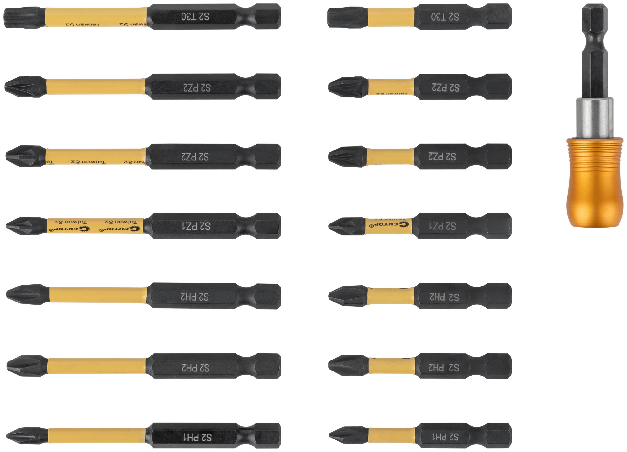 Биты 50 мм 7шт: PH1, PН2 (2 шт), PZ1, PZ2 (2 шт), T30Биты 75 мм 7шт: PH1, PН2 (2 шт), PZ1, PZ2 (2 шт), T30Адаптер для бит: 1 шт.Торсионная бита за счет эффекта скручивания способна к работе на высоких крутящих моментах, что способствует сохранению шлица биты, крепежа и увеличенному сроку службы. Подходит для работы с ударным инструментом. Намагниченный шлиц PH2 обеспечивает дополнительное удобство в работе, а также предотвращает выскальзывание, что препятствует повреждению биты и крепежа. Биты изготавливаются из стали высшего качества марки S2 по технологии Cutop, что обеспечивает увеличенный срок службы. Биты выдерживают существенный крутящий момент, что подтверждается собственными испытаниями.