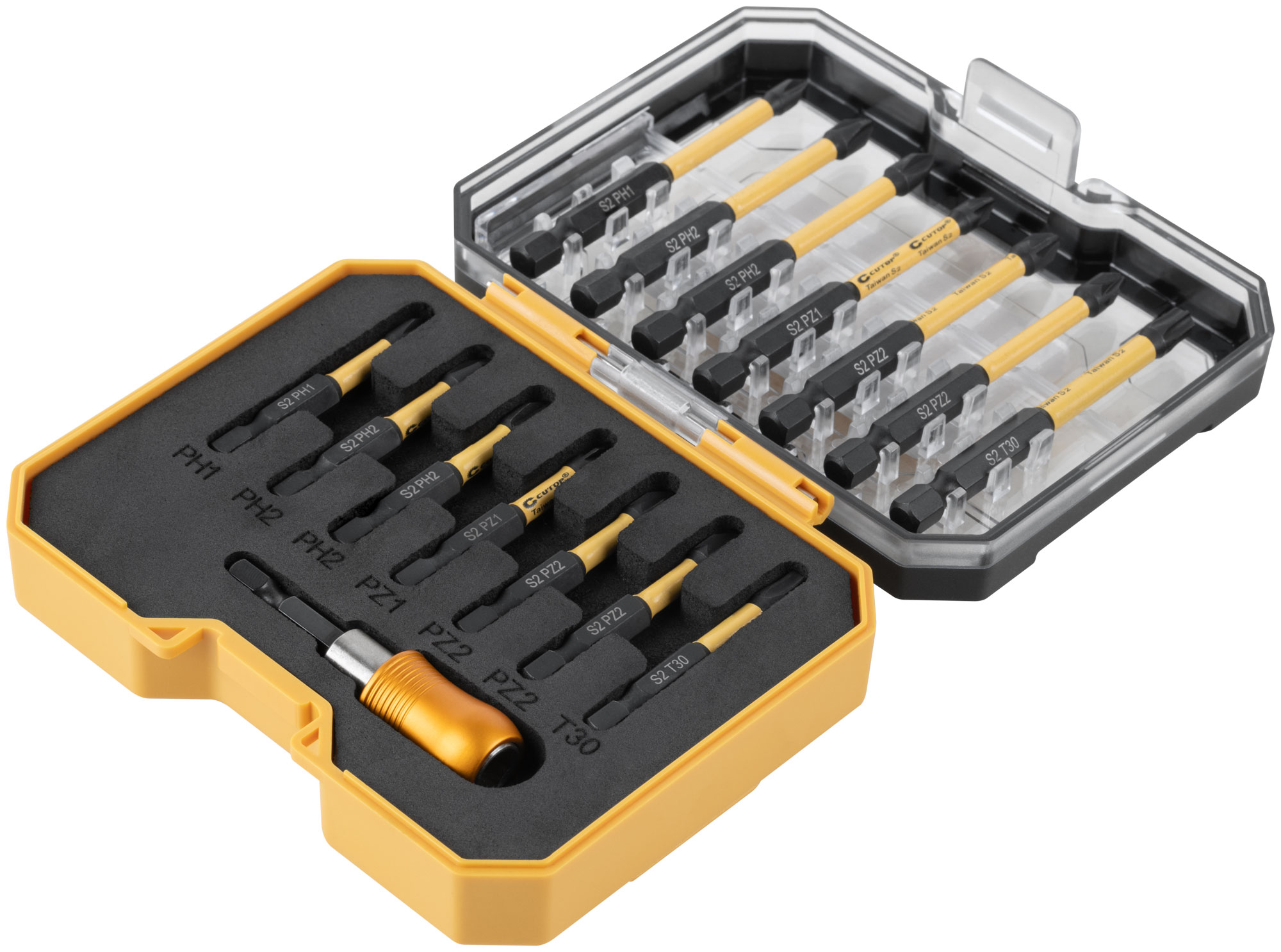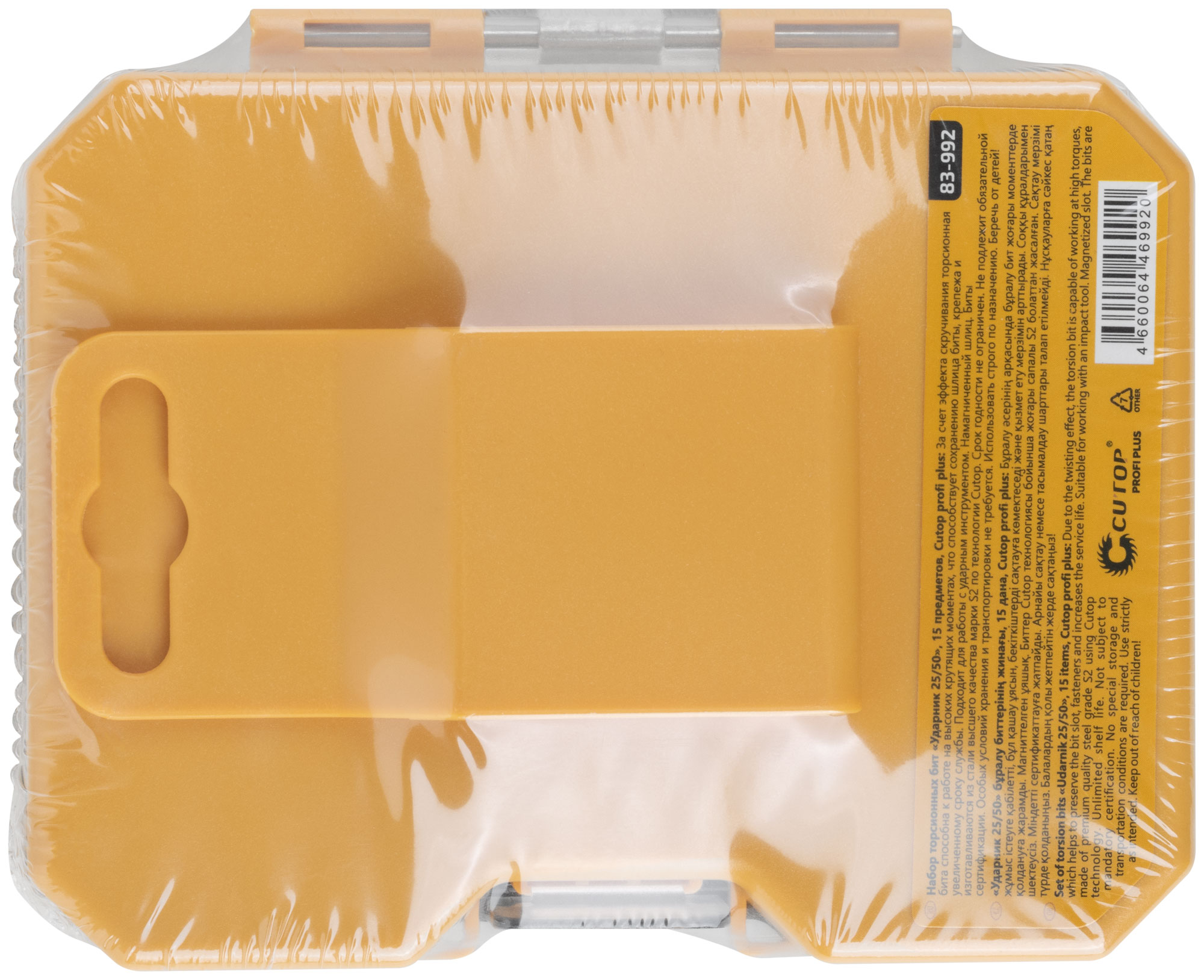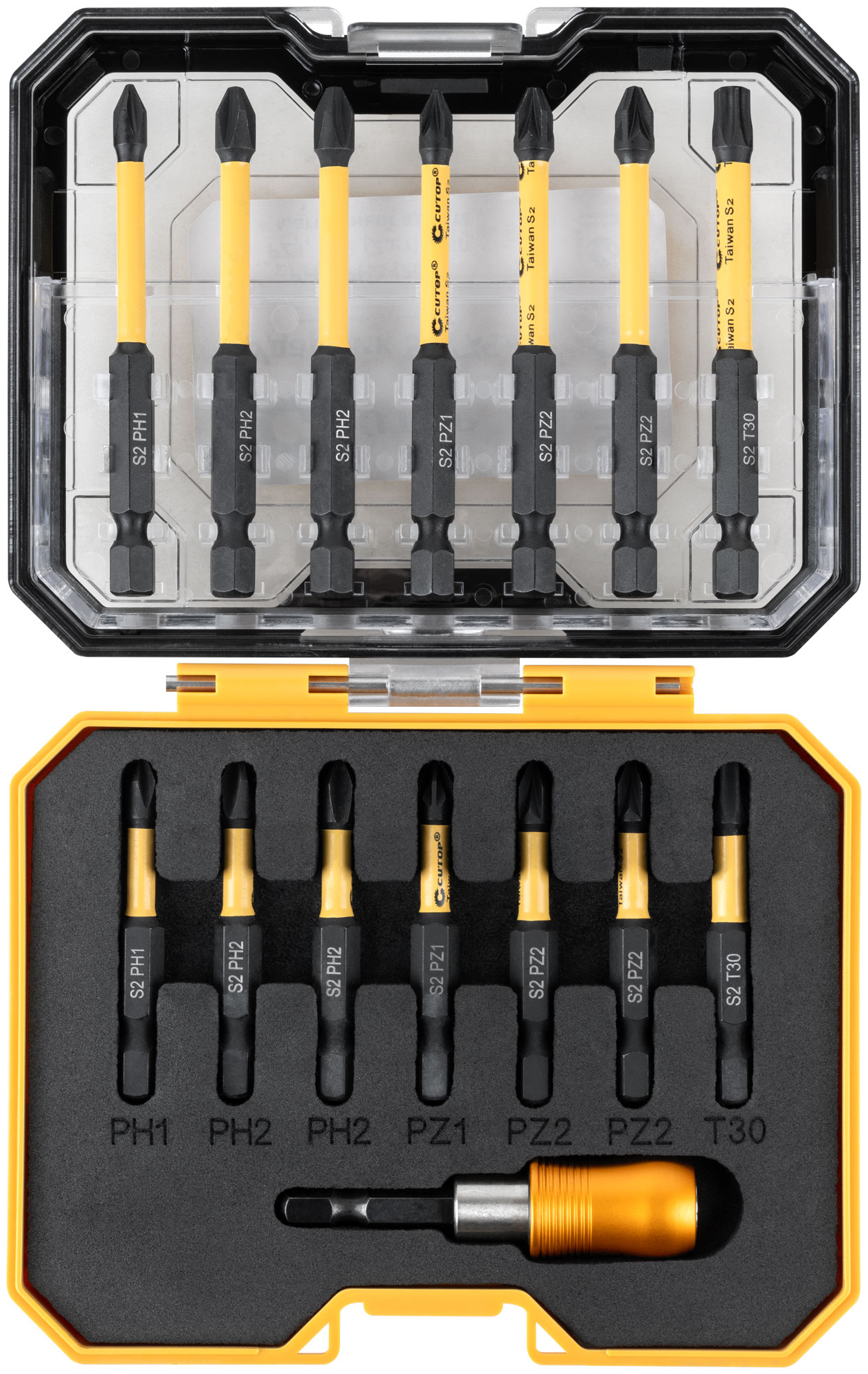Биты 50 мм 7шт: PH1, PН2 (2 шт), PZ1, PZ2 (2 шт), T30Биты 75 мм 7шт: PH1, PН2 (2 шт), PZ1, PZ2 (2 шт), T30Адаптер для бит: 1 шт.Торсионная бита за счет эффекта скручивания способна к работе на высоких крутящих моментах, что способствует сохранению шлица биты, крепежа и увеличенному сроку службы. Подходит для работы с ударным инструментом. Намагниченный шлиц PH2 обеспечивает дополнительное удобство в работе, а также предотвращает выскальзывание, что препятствует повреждению биты и крепежа. Биты изготавливаются из стали высшего качества марки S2 по технологии Cutop, что обеспечивает увеличенный срок службы. Биты выдерживают существенный крутящий момент, что подтверждается собственными испытаниями.