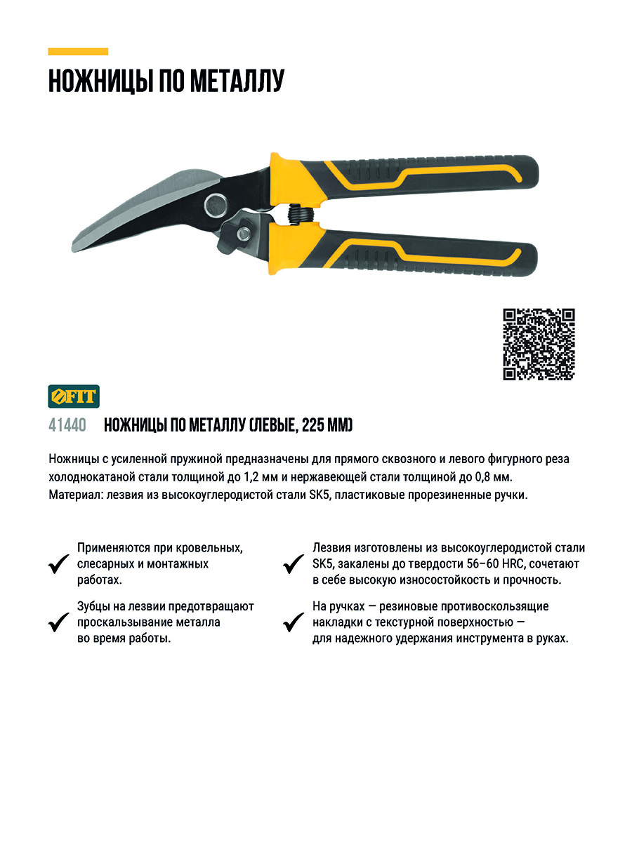 Для прямого сквозного и левого фигурного реза холоднокатанной стали толщиной до 1,2 мм и нержавеющей стали толщиной до 0,8 мм. Усиленная пружина.Материал: лезвия из высокоуглеродистой стали SK5,пластиковые прорезиненные ручки. Упаковка: блистер.