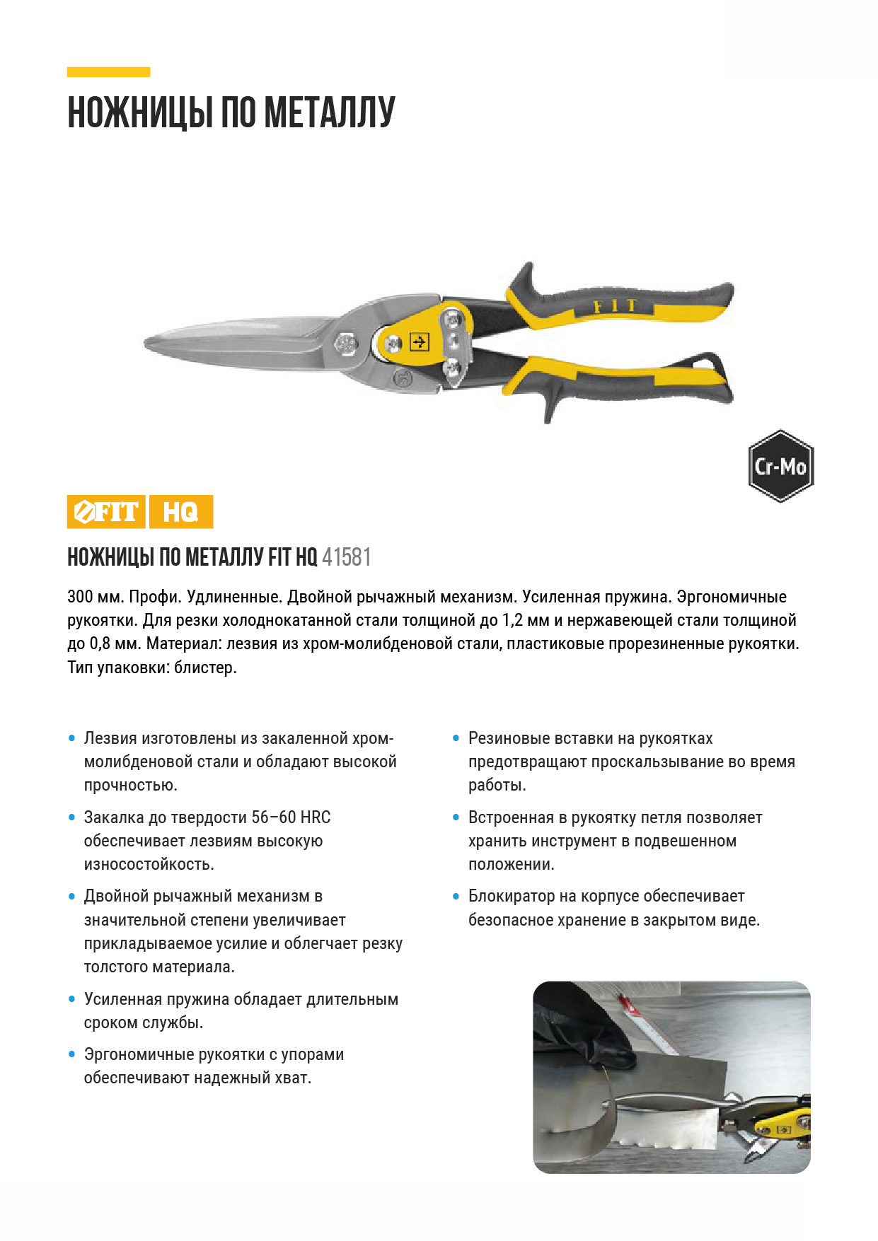Профи. Удлиненные. Двойной рычажный механизм. Усиленная пружина. Эргономичные ручки. Специальные зубцы предотвращают скольжение при резке. Для резки холоднокатанной стали толщиной до 1,2 мм и нержавеющей стали толщиной до 0,8 мм. Материал: лезвия из хром-молибденовой стали, пластиковые прорезиненные ручки. Упаковка: блистер.