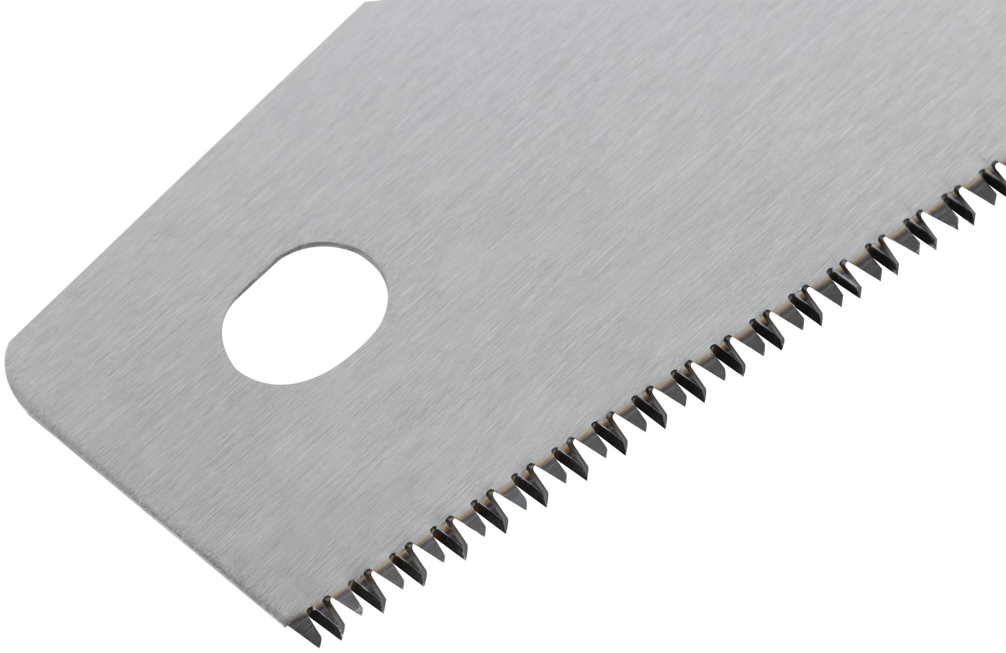 Мелкий зуб (12 TPI) с трехгранной заточкой и высокочастотной закалкой. Для тонкого пиления древесины мягких и твердых пород , ламината, ДСП, фанеры и пластика. Материал: инструментальная сталь, пластиковая прорезиненная ручка.