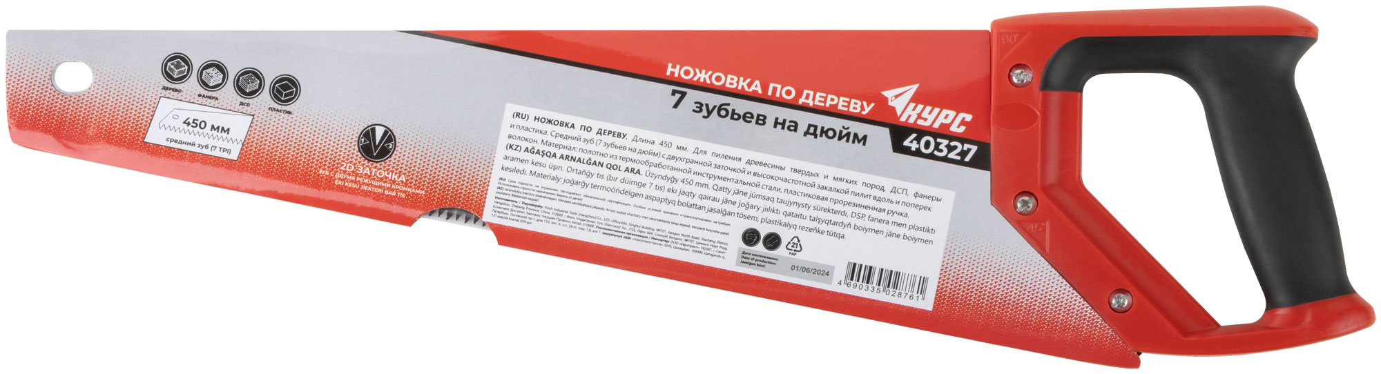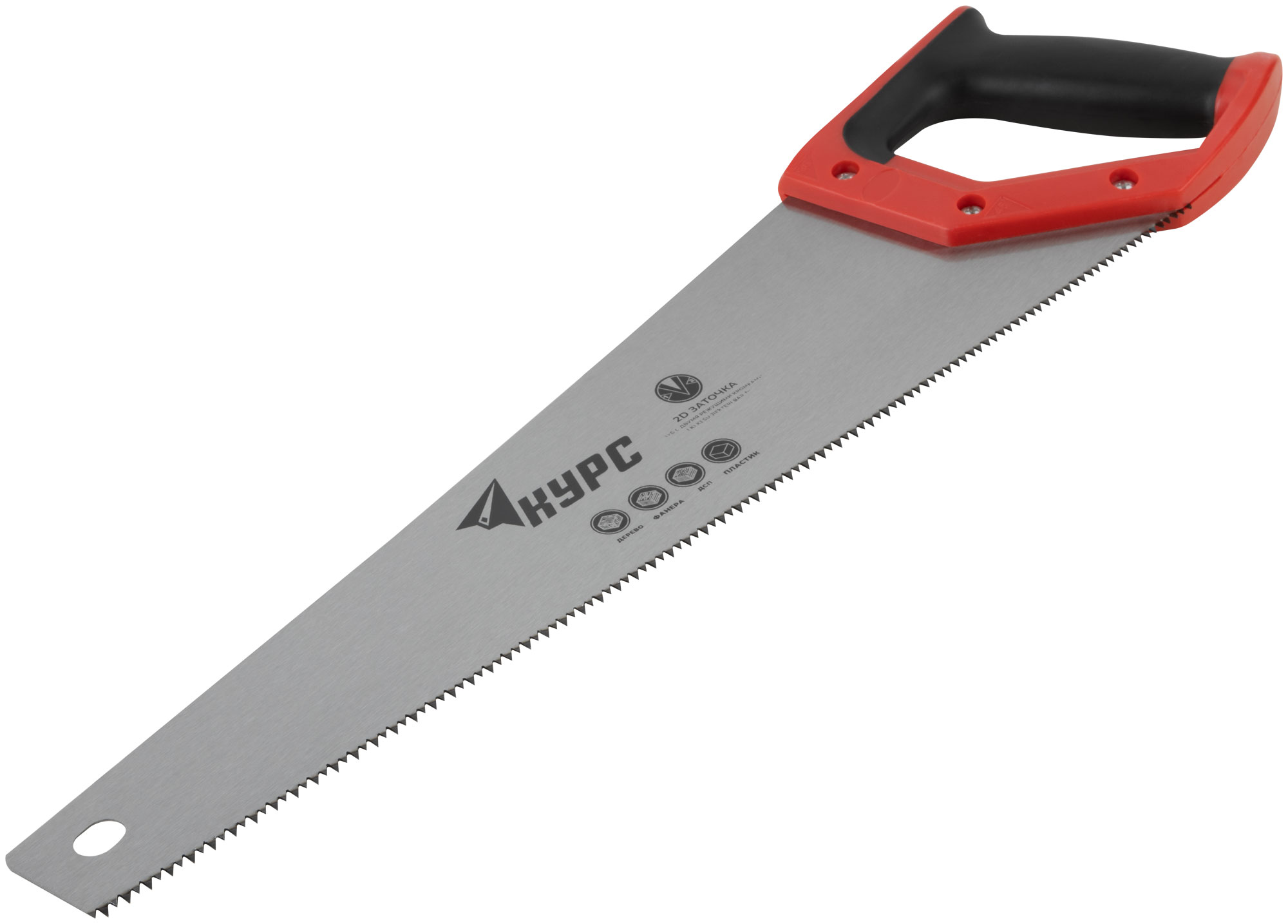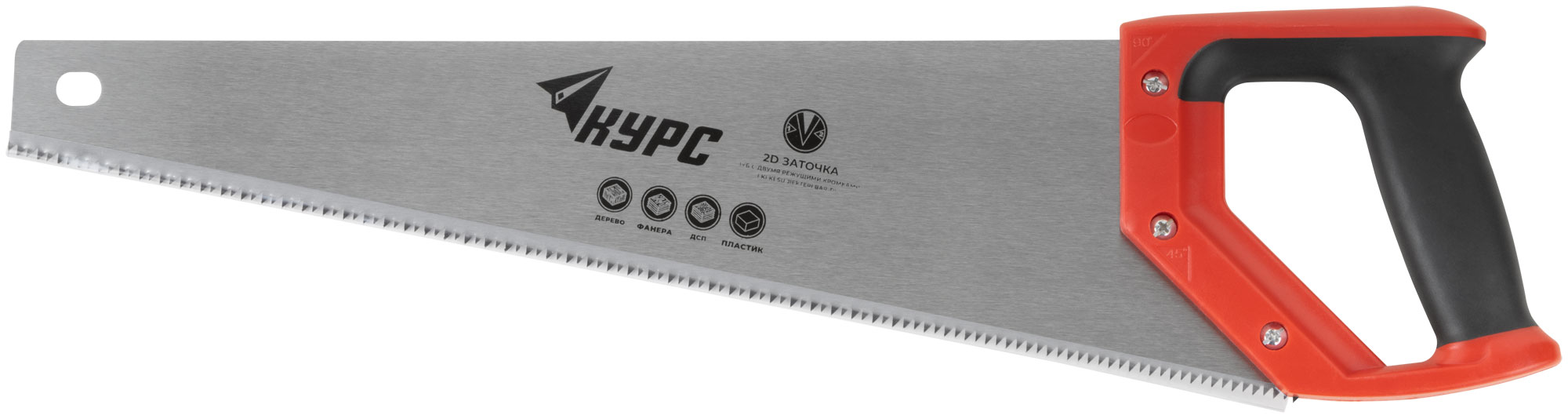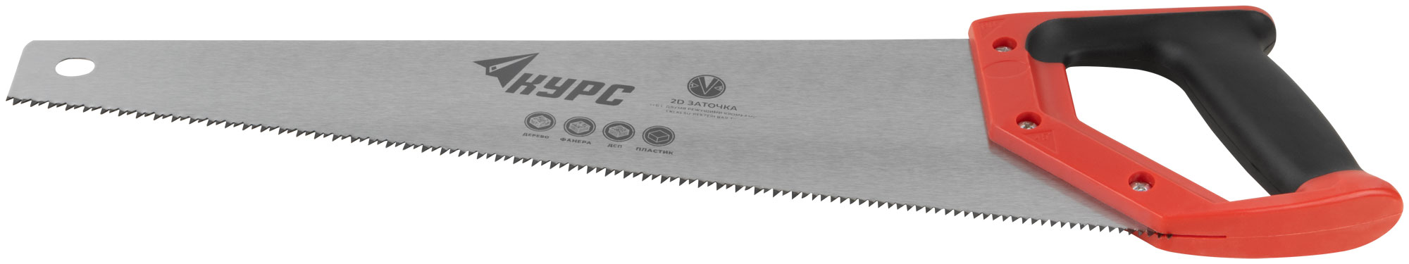 Ножовка по дереву, средний каленый зуб 7 ТPI, 2D заточка, пластиковая прорезиненная ручка 450 мм