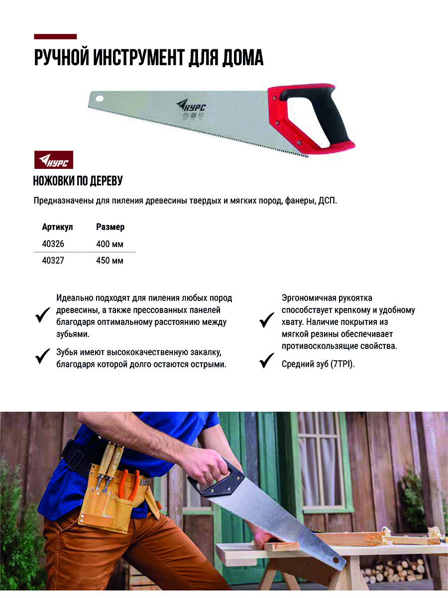 Средний зуб (7TPI). Для работы с древесиной твердых и мягких пород, фанерой, ДСП. Разведенные и закаленные зубья пилят вдоль и поперек волокон. Материал: инструментальная сталь, пластиковая прорезиненная ручка .